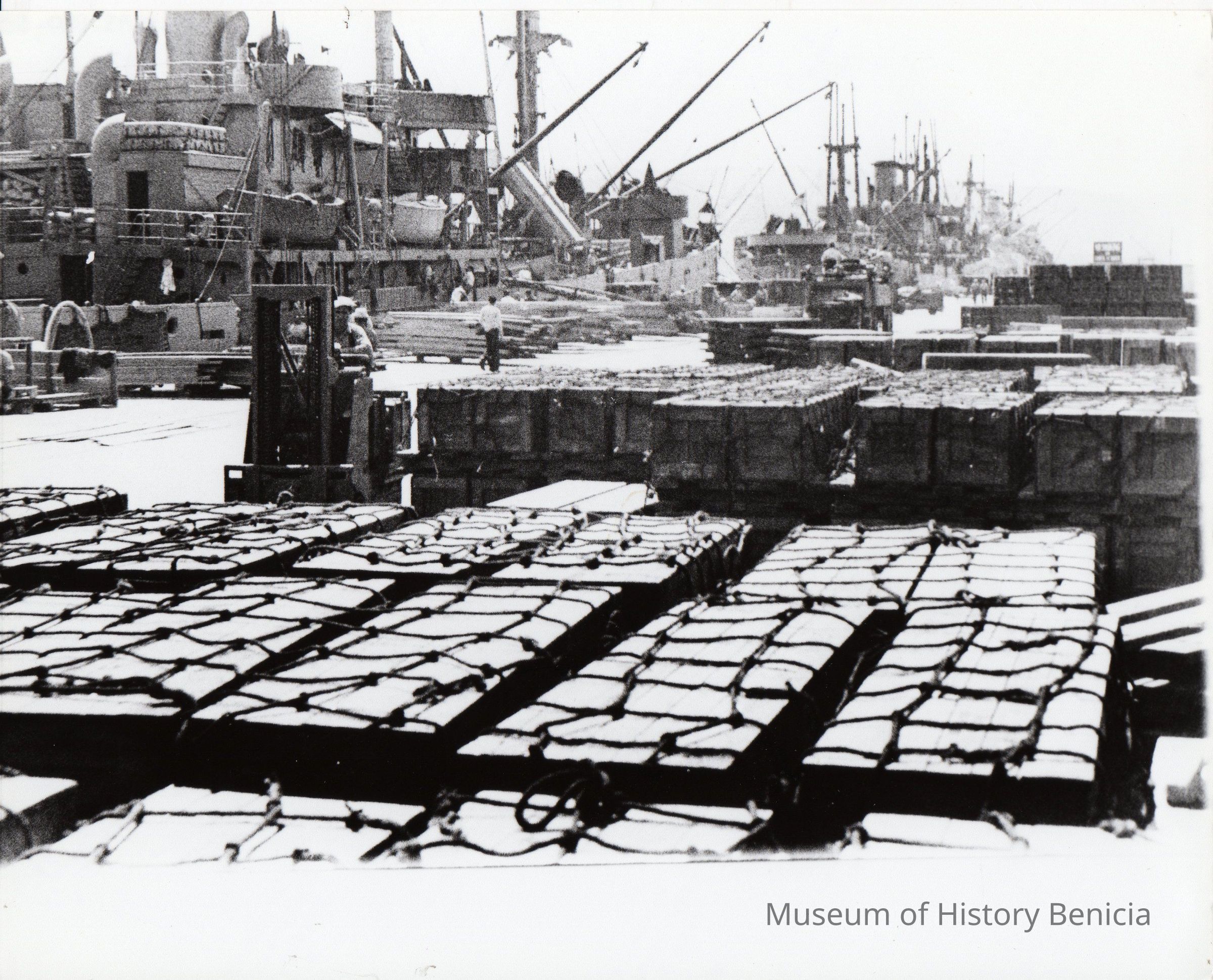 Military supplies being loaded aboard liberty ships at Benicia Arsenal docks during World War II. B/W photo.