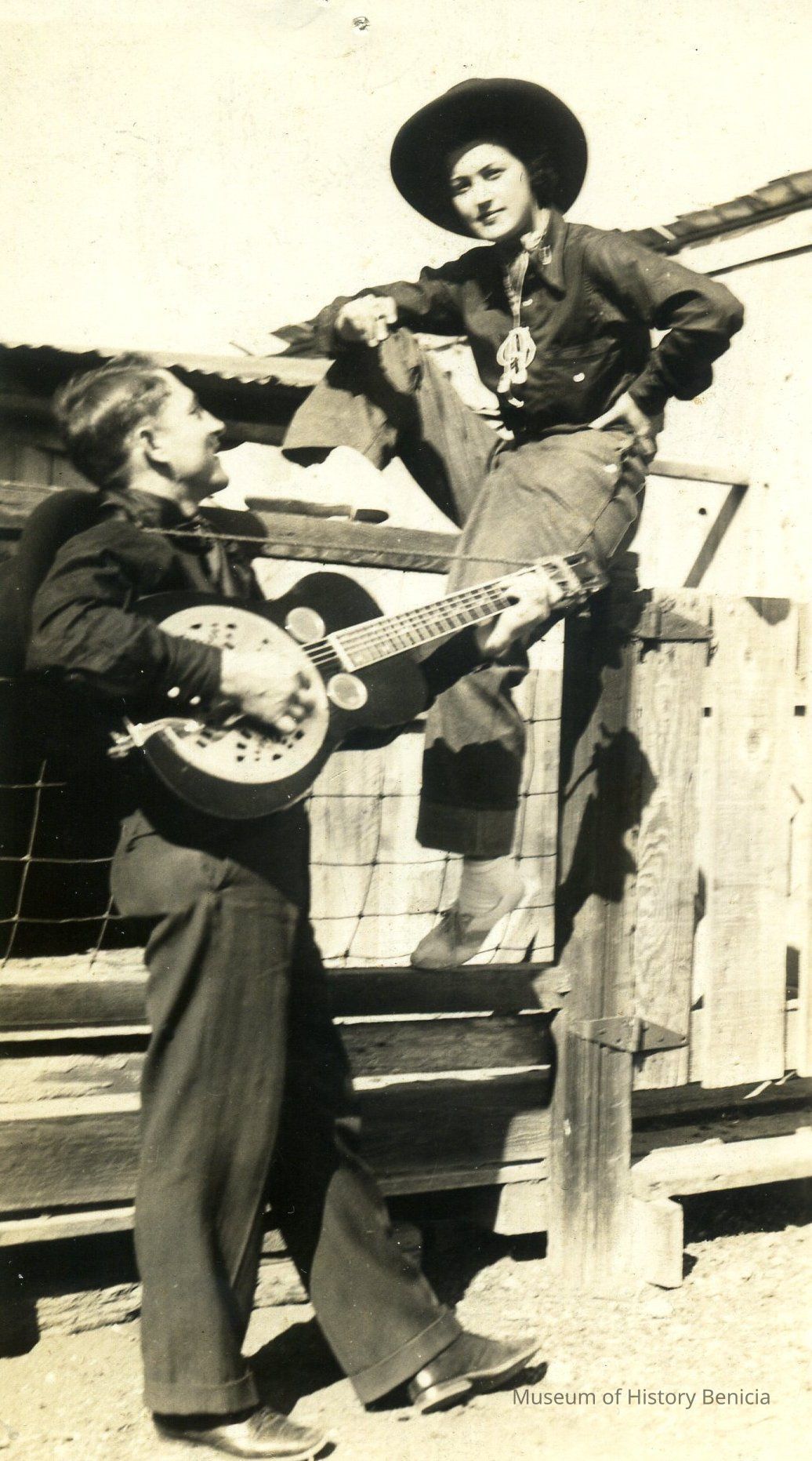 B/W Photograph - Unidentified man and woman, he is seranading her and using a guitar; they are dressed in early California costumes; 3" x 5"Collection
