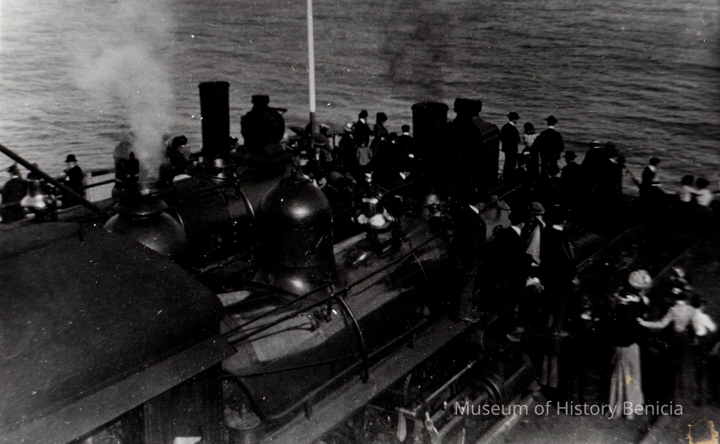 B/W Photograph: People and train aboard the train ferry "Solano" looking toward Benicia.