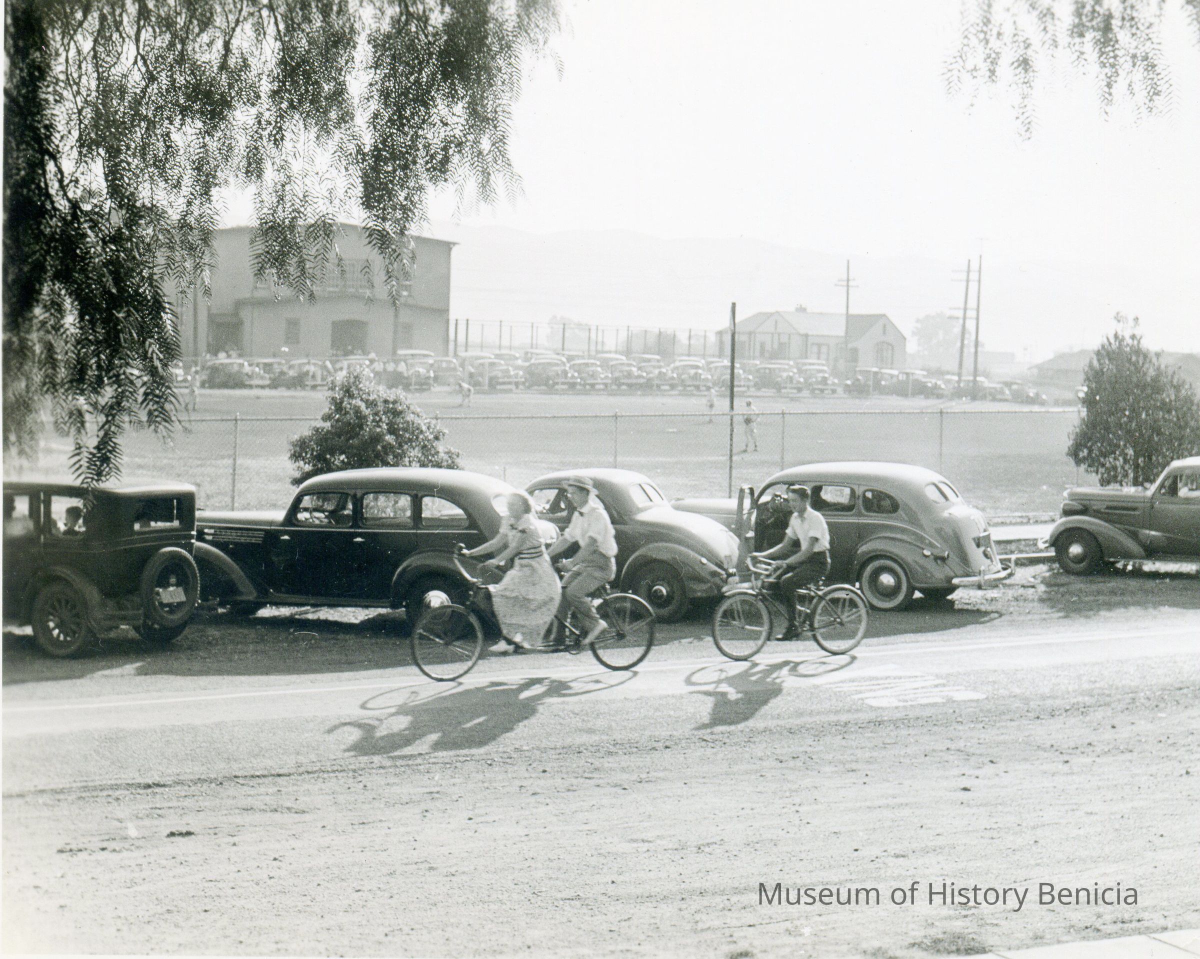 This is a photo of Jean and Donald E Stoner on bikes in Benicia on East L street. In the background is the old gym, Benicia High School playing field, Sanborn field, and the future spot of the Post Office.