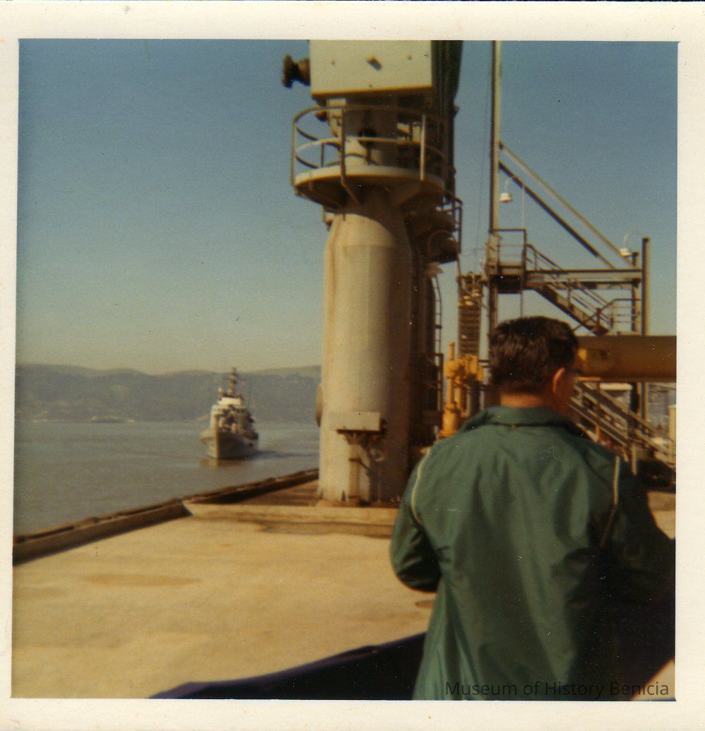 Color photograph of USS Benicia visiting Benicia. The ship was given to Korea in 1970