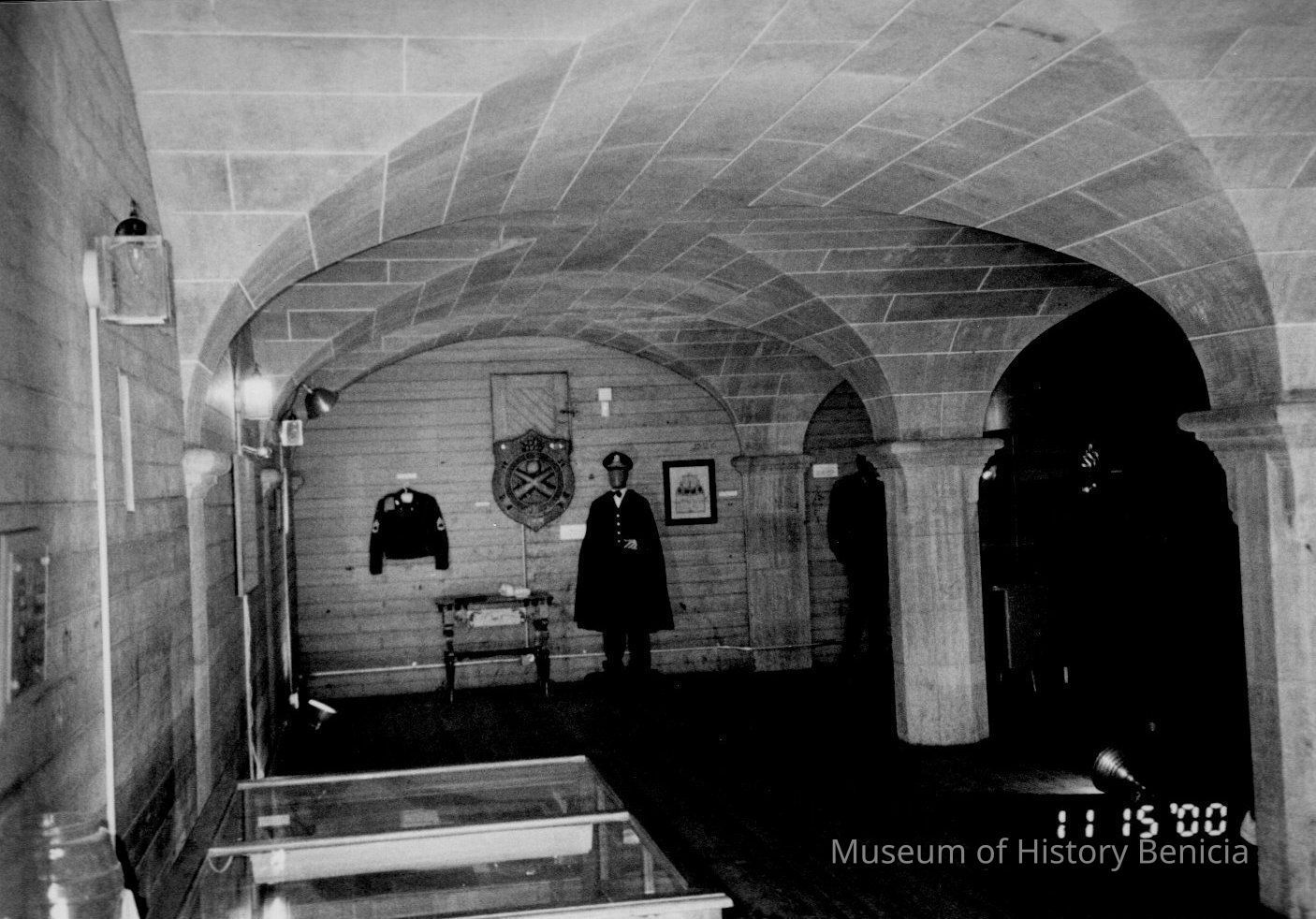 B/W Photograph: Interior picture of the Powder Magazine 10, with mannequin in center.