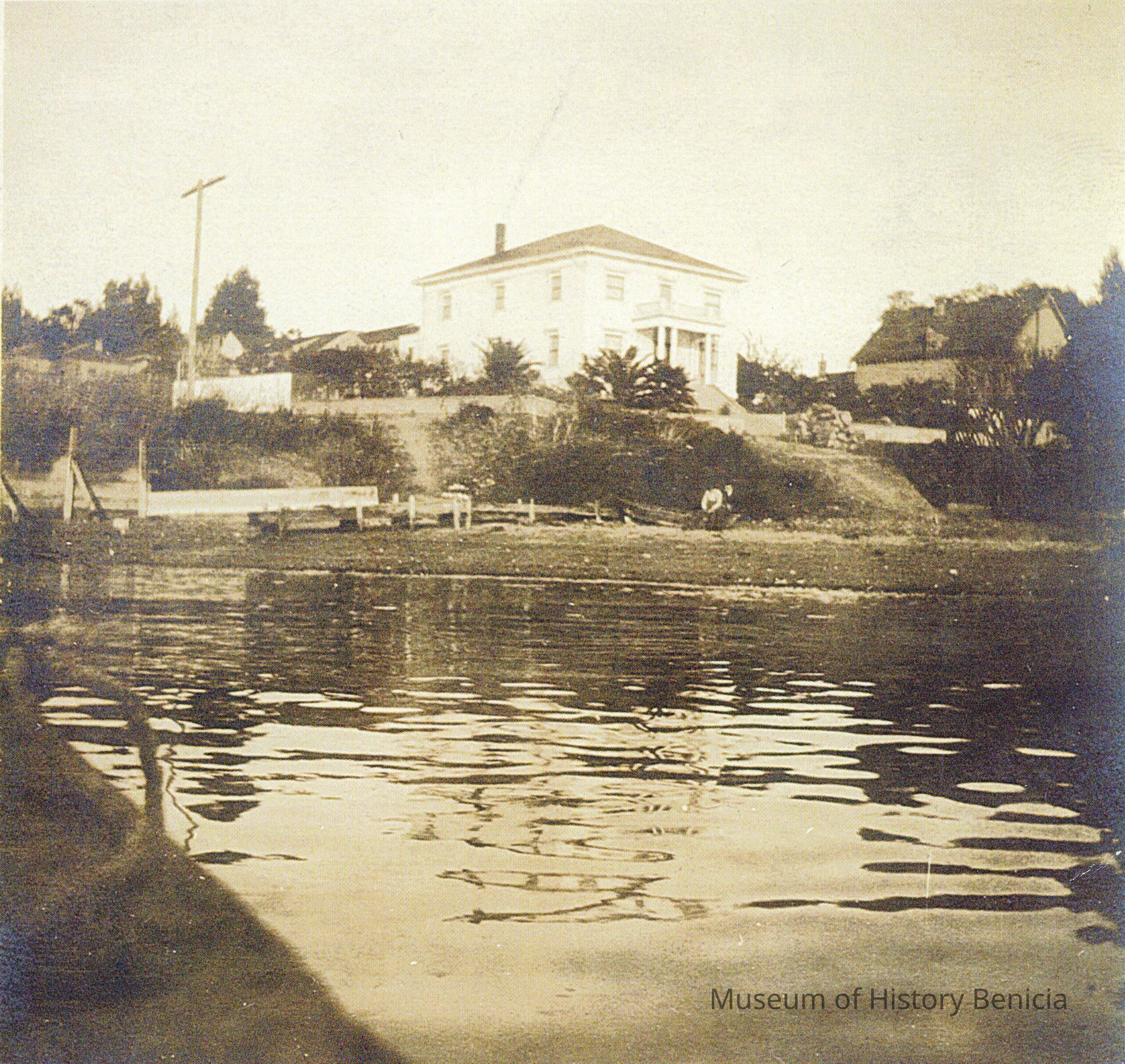 This is a photo of a house by the water in Benicia. The back says the house was located on the corner of West 2nd and G st. A known resident/owner(?) was a Mrs. Murphy. She was known for her kindness to troubled teenage girls and assisted them if she could. The house overlooks Benicia Beach. It was known as the "Pleasanton".Collection