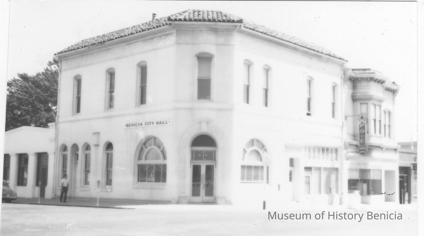 B/W Photograph: City Hall's temporary quarters in old bank building on First Street. City Hall was housed there after moving out of the State Capitol. Note the PG&E office and Victory Cleaners to the Southside of the building. The building was also known as the Bohn Building.
