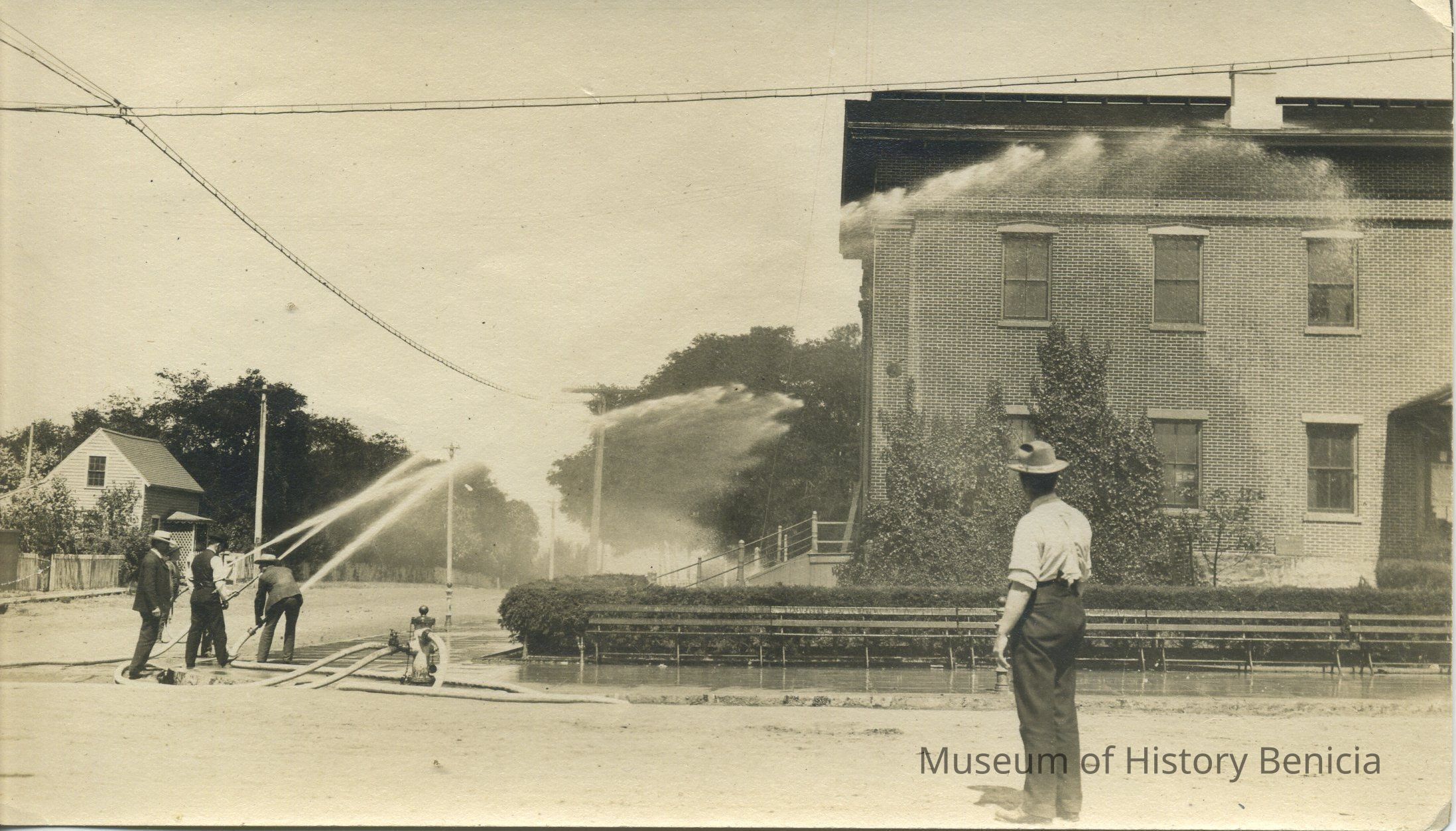 Benicia Fire Department Drill July 1906. Using firehoses at the capitol. Man standing watching at the right.