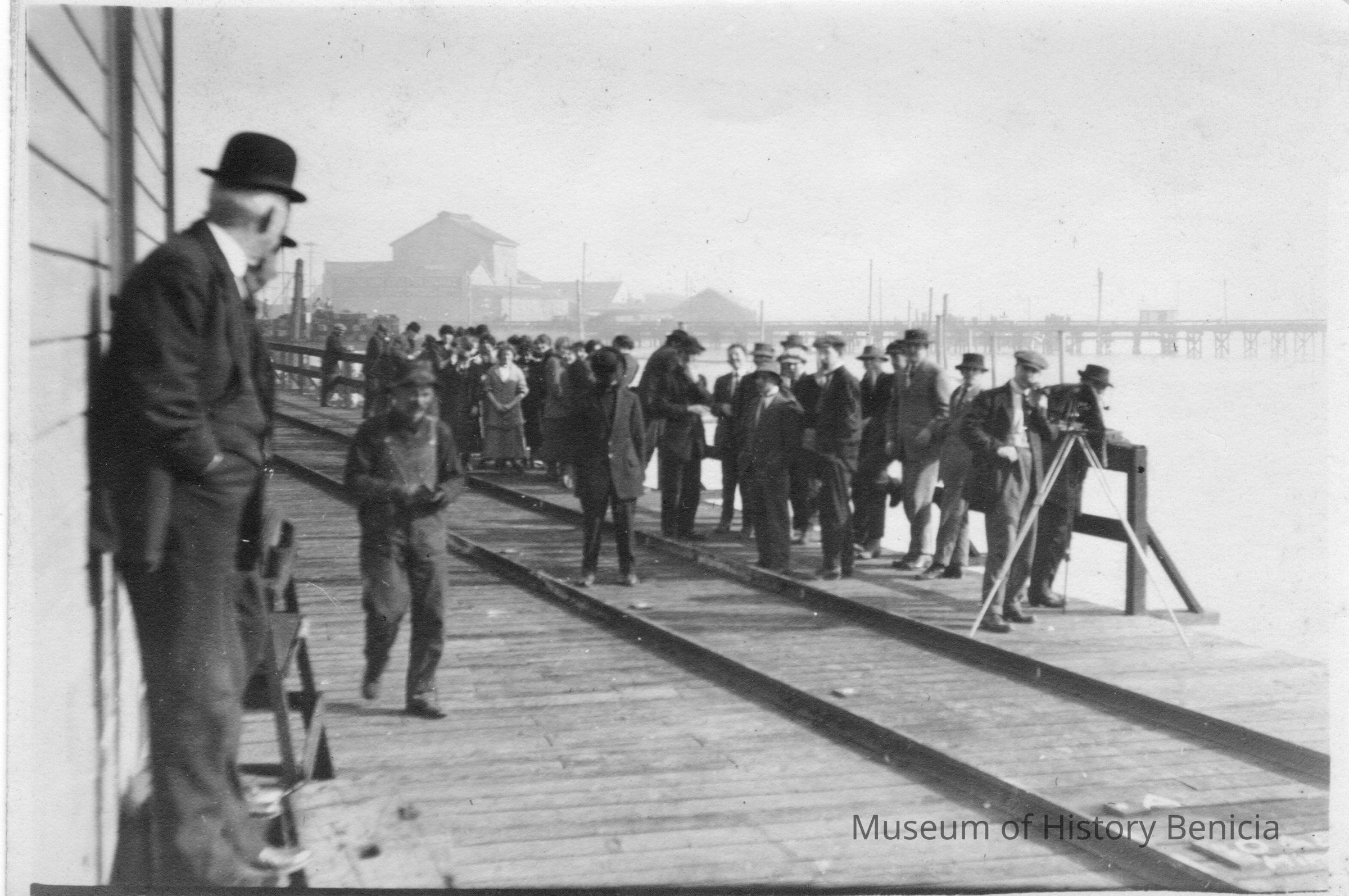 Photograph of Carquinez Straits and a pier with a lot of people standing around waiting. Some have cameras and there are railroad tracks on the dock.