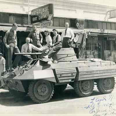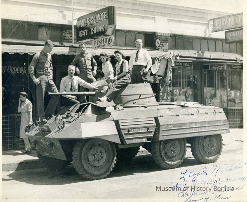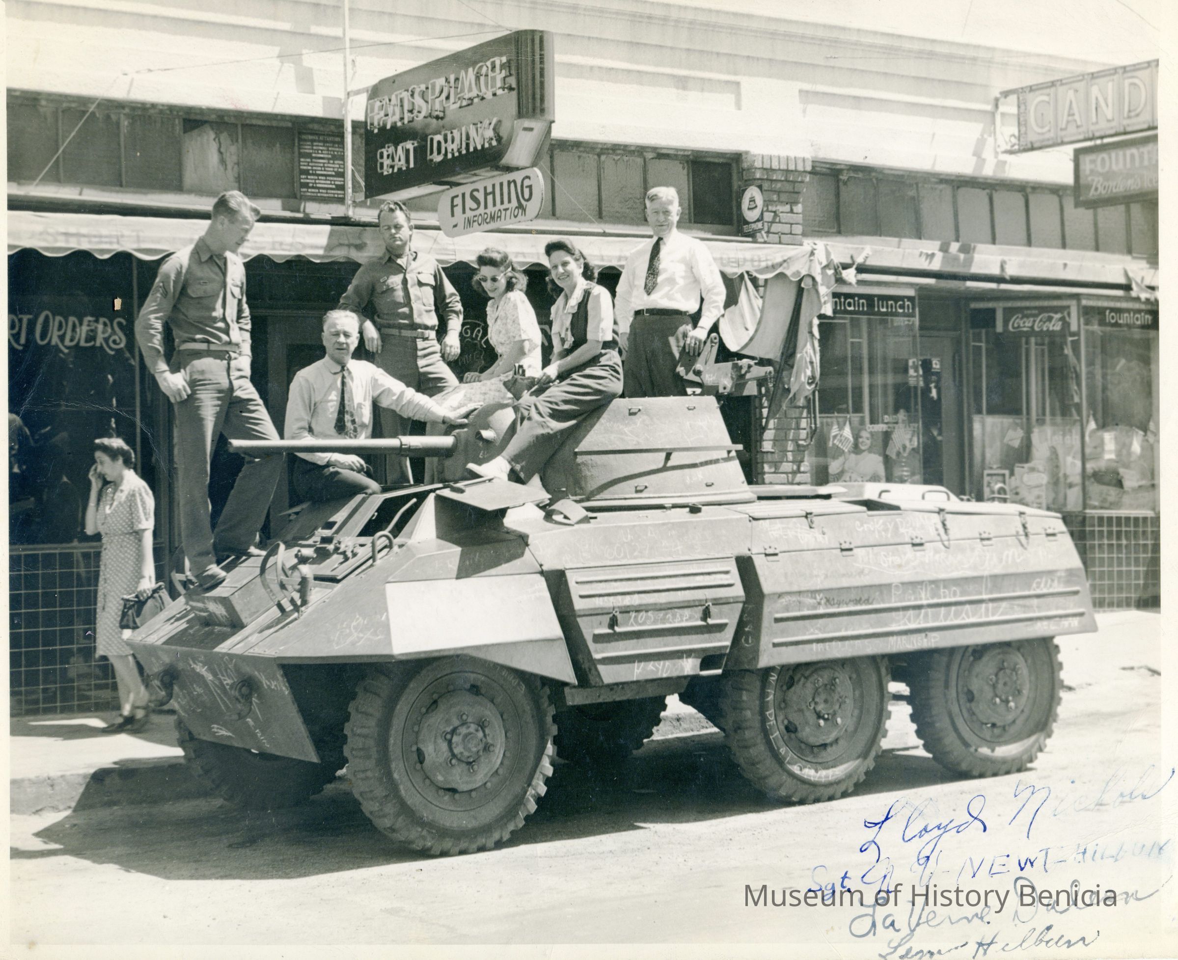 This is a photo of a tank parked in downtown (Vallejo?) with several people on top. The names on the photo are: