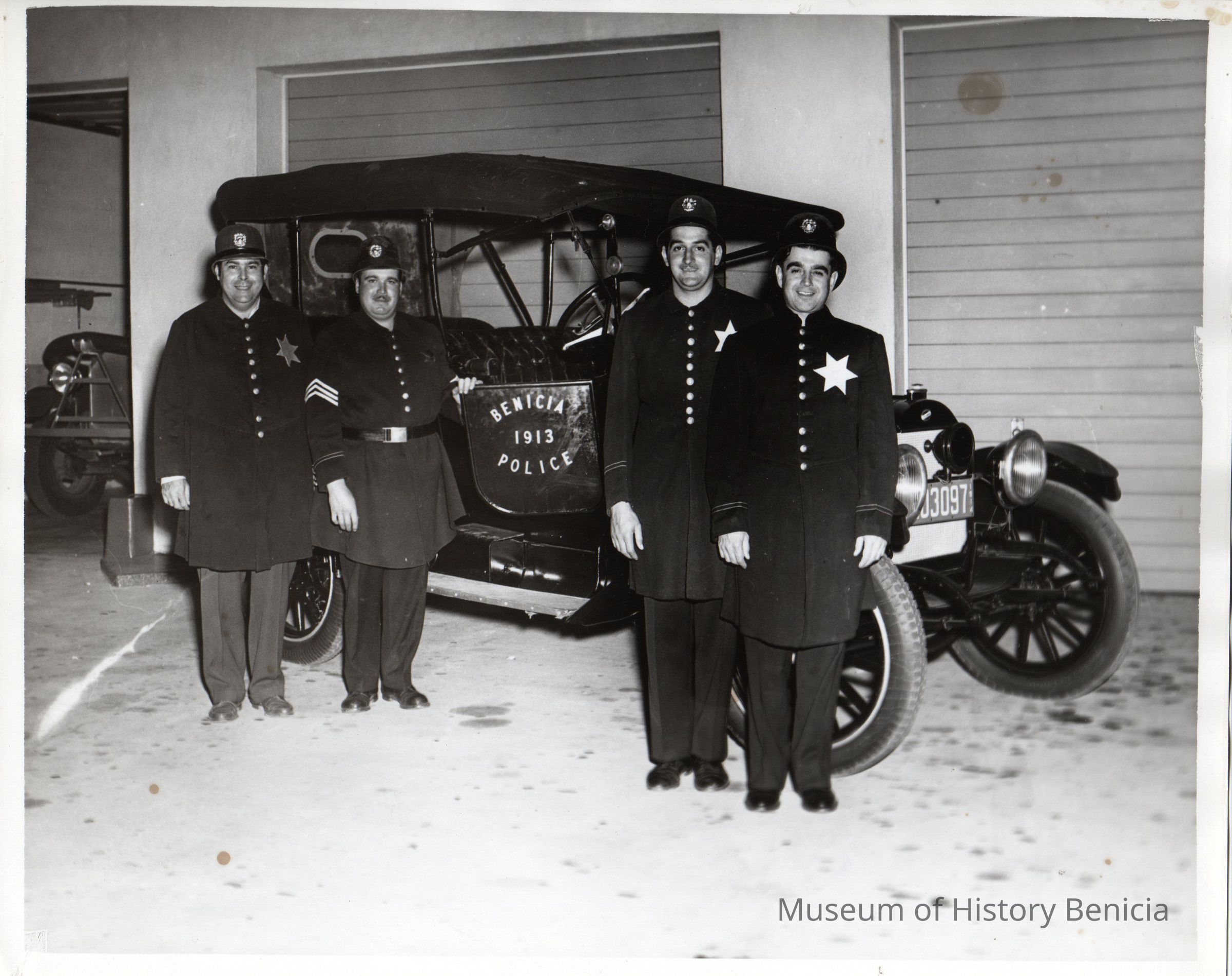 B/W Photograph of four men dressed in police officer's uniforms standing in front of an old police car that has written on the door "Benicia Police 1913"Collection