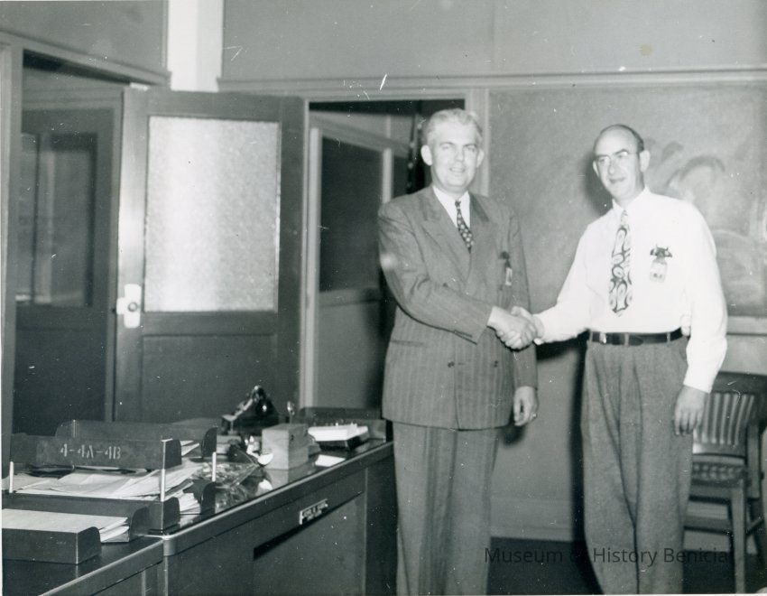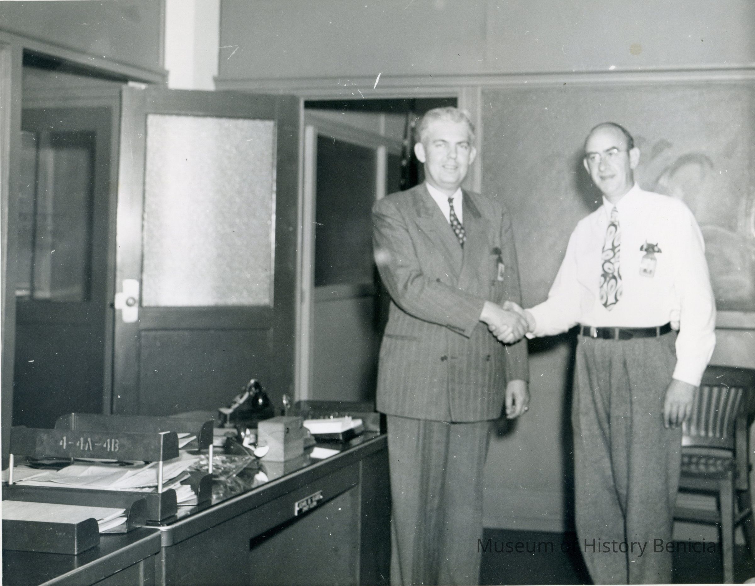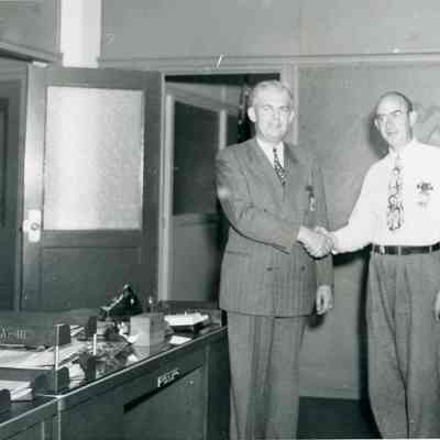 Black and white photo of Walter Kamb (left) and Bernard Hoffer (right) in civilian clothes shaking hands in an office.