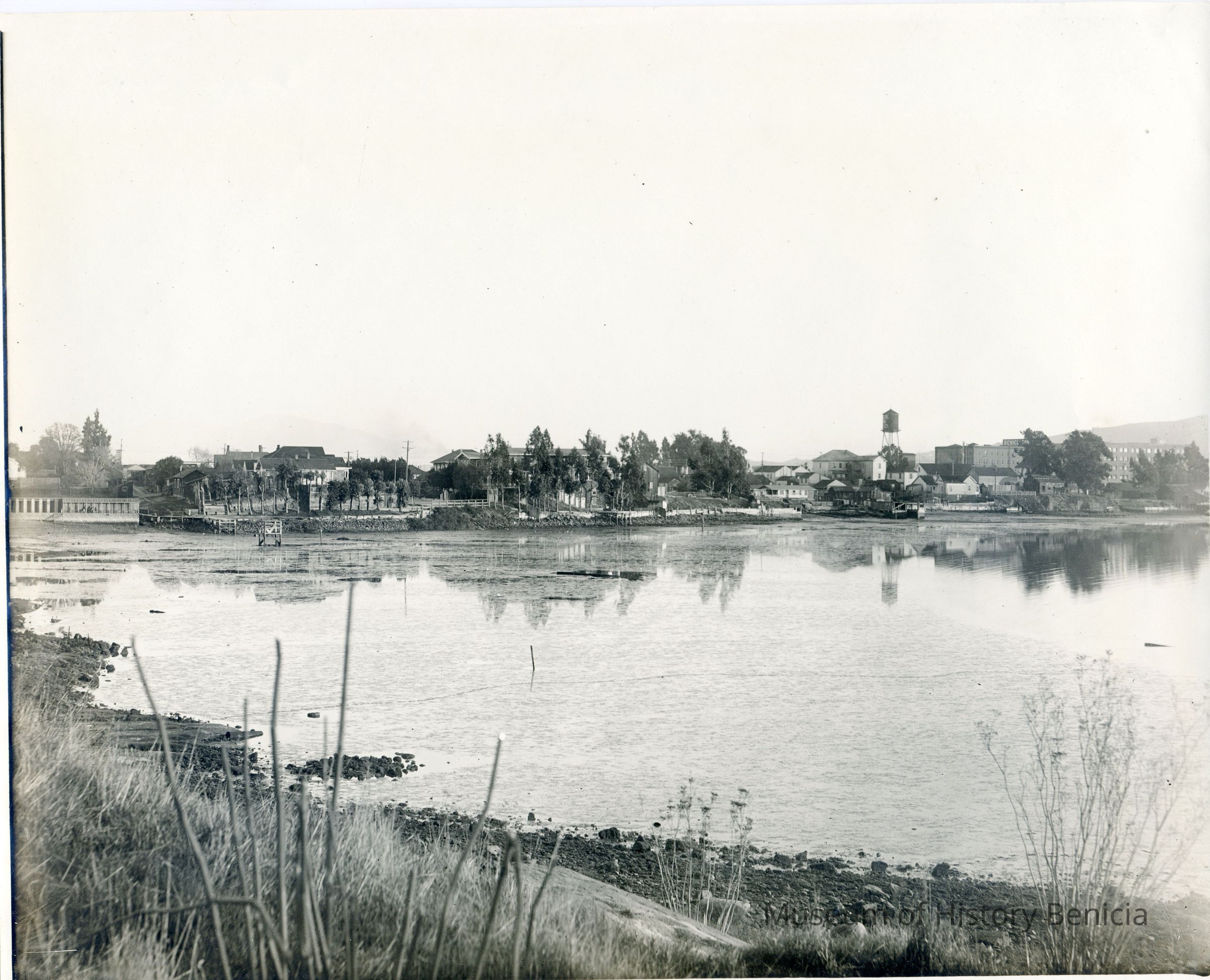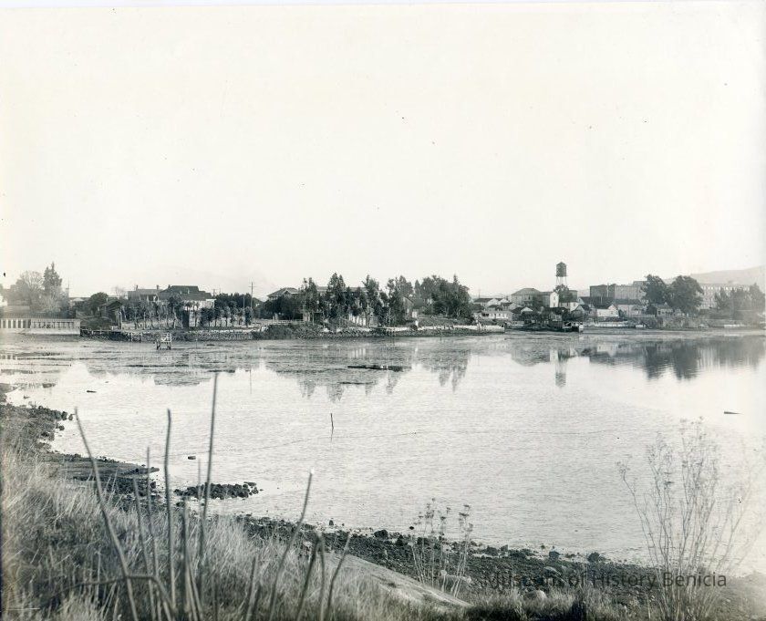 Scene of Benicia (?) across from a small area of water.
