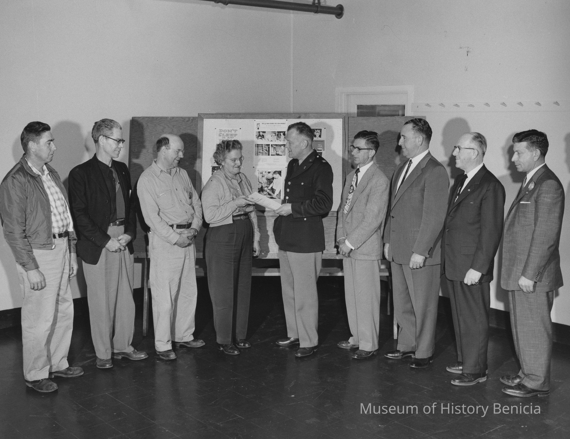 B/W Photograph: showing eight men and one woman in center being presented with a certificate by Colonel Lawther. A bulletin board is behind them. On back: "04071-306-1 / AM-55" and U.S. Army stamp.Collection