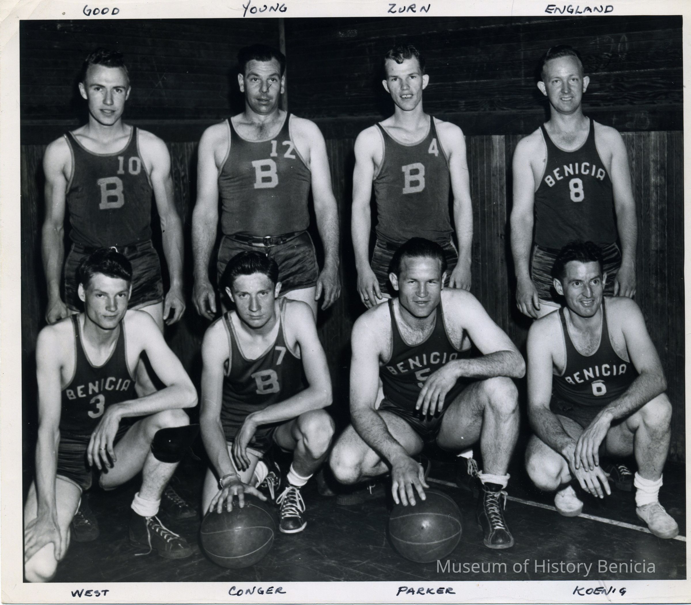 Benicia Arsenal Basketball Team. Koenig at lower right. All players identified in margins. Black and white photo.