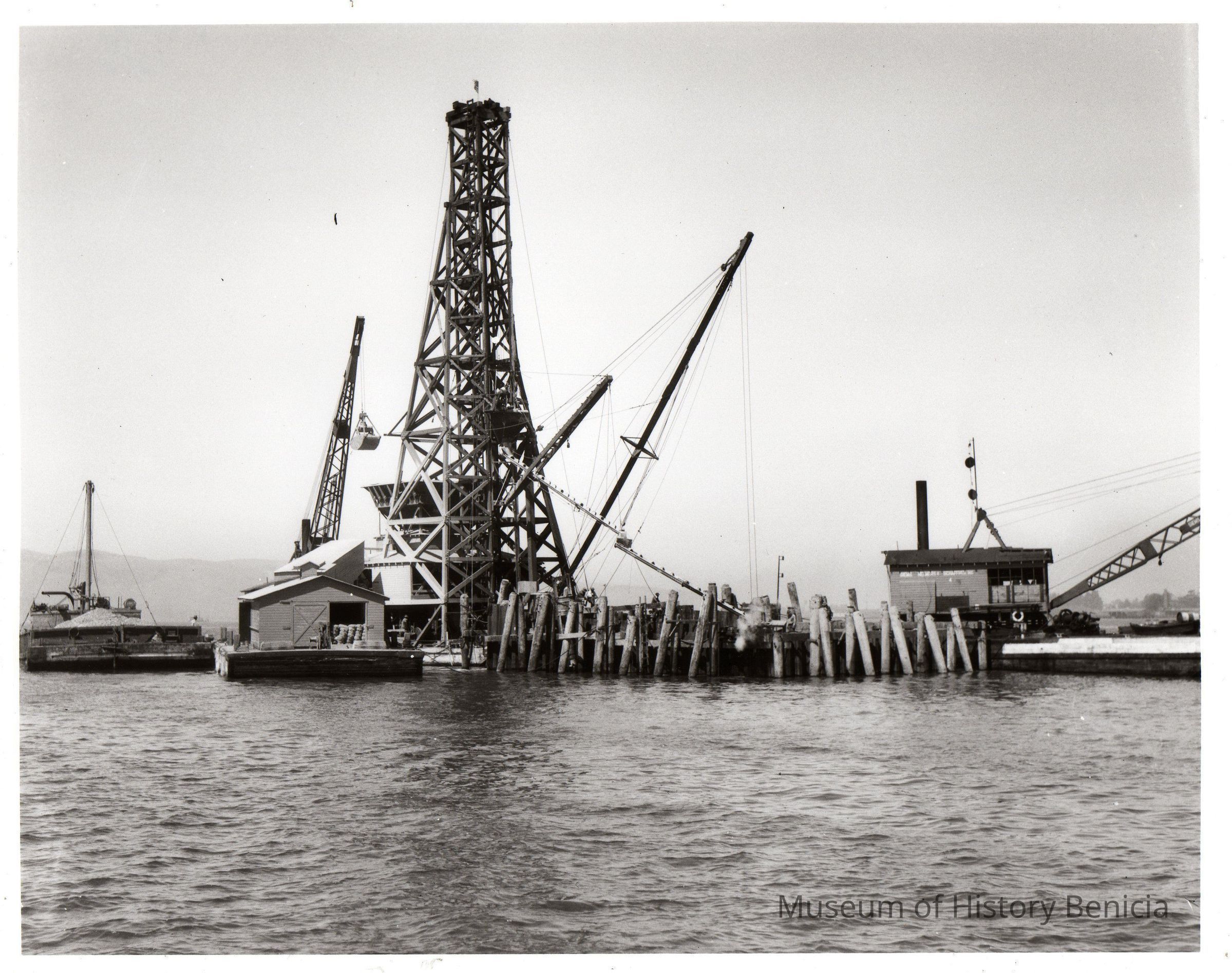 B/W Photograph: Benicia dock in the water-- big cranes.