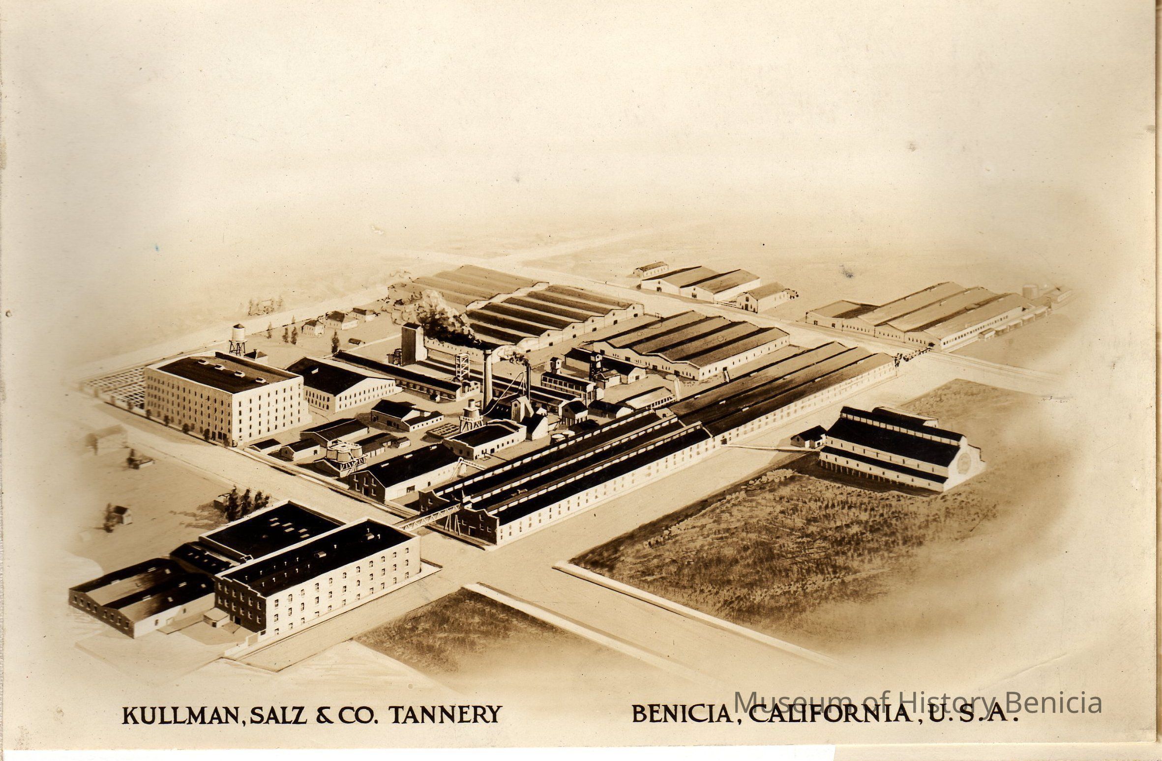 Sepia-tone photograph from an album: lithograph of the Kullman, Salz & Co. Tannery building layout, it is the first "photograph" in the album