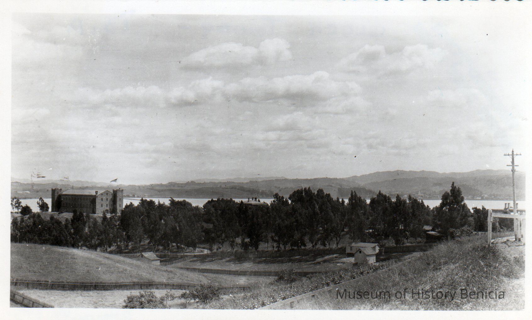 B/W photograph of the Benicia Arsenal with the Clock Tower on the left.