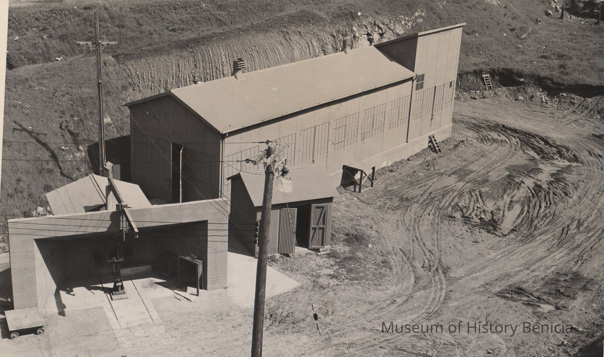 B/W Photograph: BA 800-34-C building 96 - the Shell Loading Plant. In the left foreground is the Deboostering Barricade. The small building in the center is the vacuum cleaner. Construction: foundations - concrete, floor - concrete, walls - flat galvanized iron (#18), roof - corrugated iron (#24)Collection