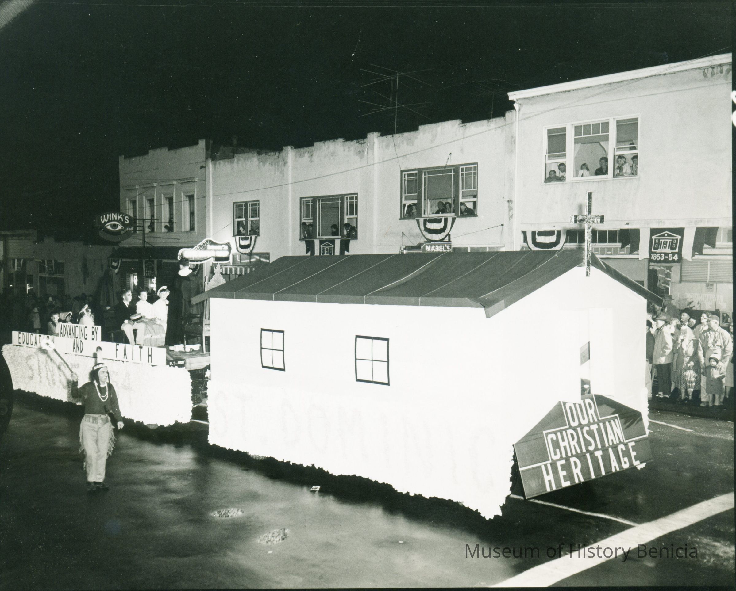 This is a photo of the celebration of the restoration of the old State Capitol in 1958. It shows the parade they had as part of the celebration. This photo shows a float for our Christian Heritage. Their moto is "Advancing by Education and Faith".Collection