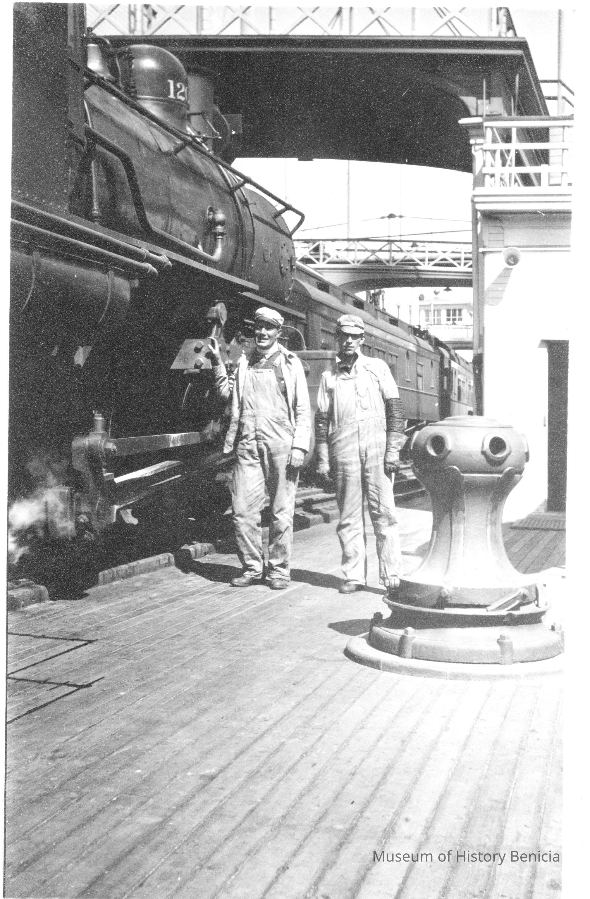 Photo of train engineers next to a train being loaded/unloaded from a ferry boat.