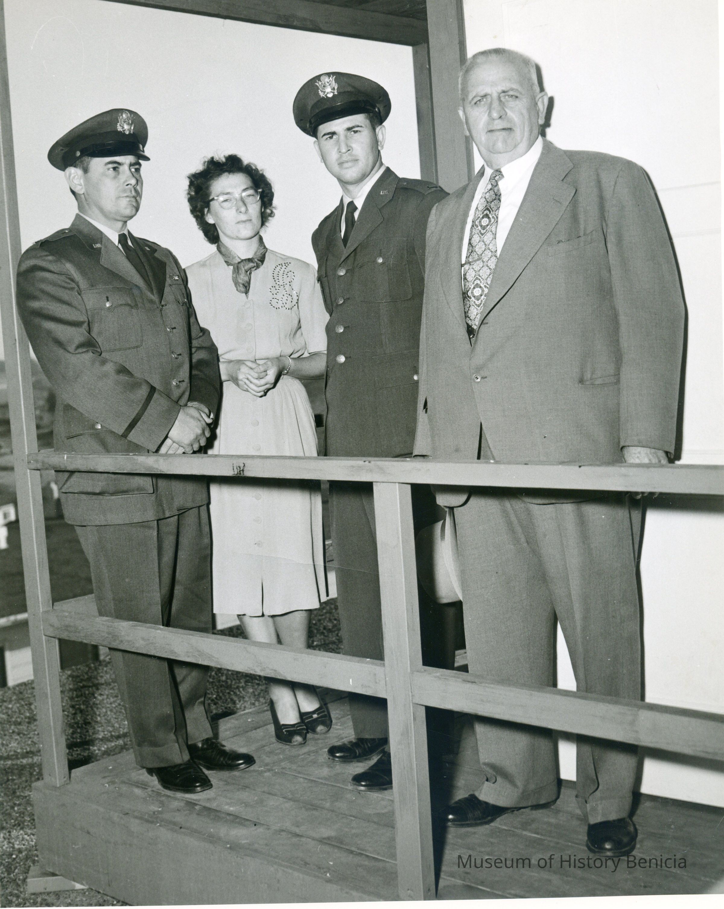 B/W (glossy) photograph of four individuals on watch tower: two Air Force officers, names unknown; Barbara Fugate; and Benicia Mayor Tom Wright.Collection