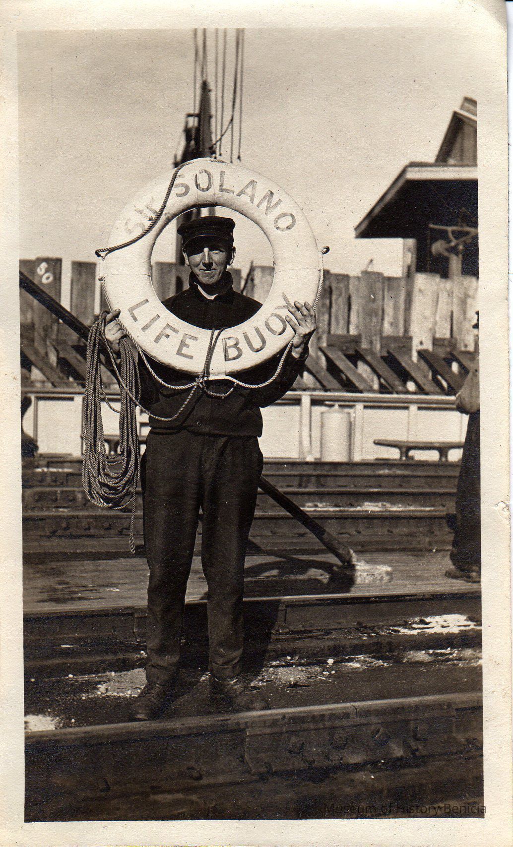 B/W photograph of an unidentified man looking through a life buoy that has written on it Solano Life Buoy.