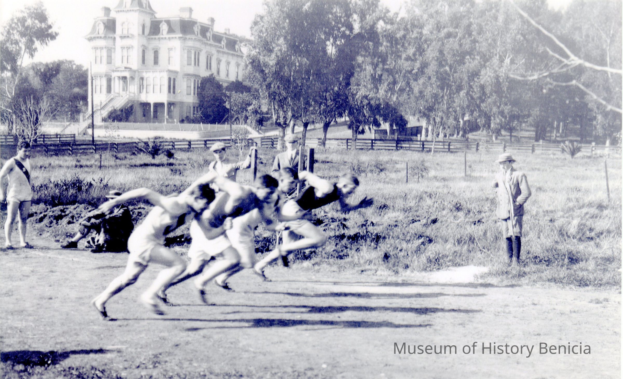 This is a copy of a photo of a track meet in Benicia. It is taking place next to the Hastings mansion. Photo 2014.011.0298 says that the meet took place on 04/08/1911 and was a SCAL (Solano County Athletic League) meet. The photo is from the Marjorie Stoner Elmore collection.Collection