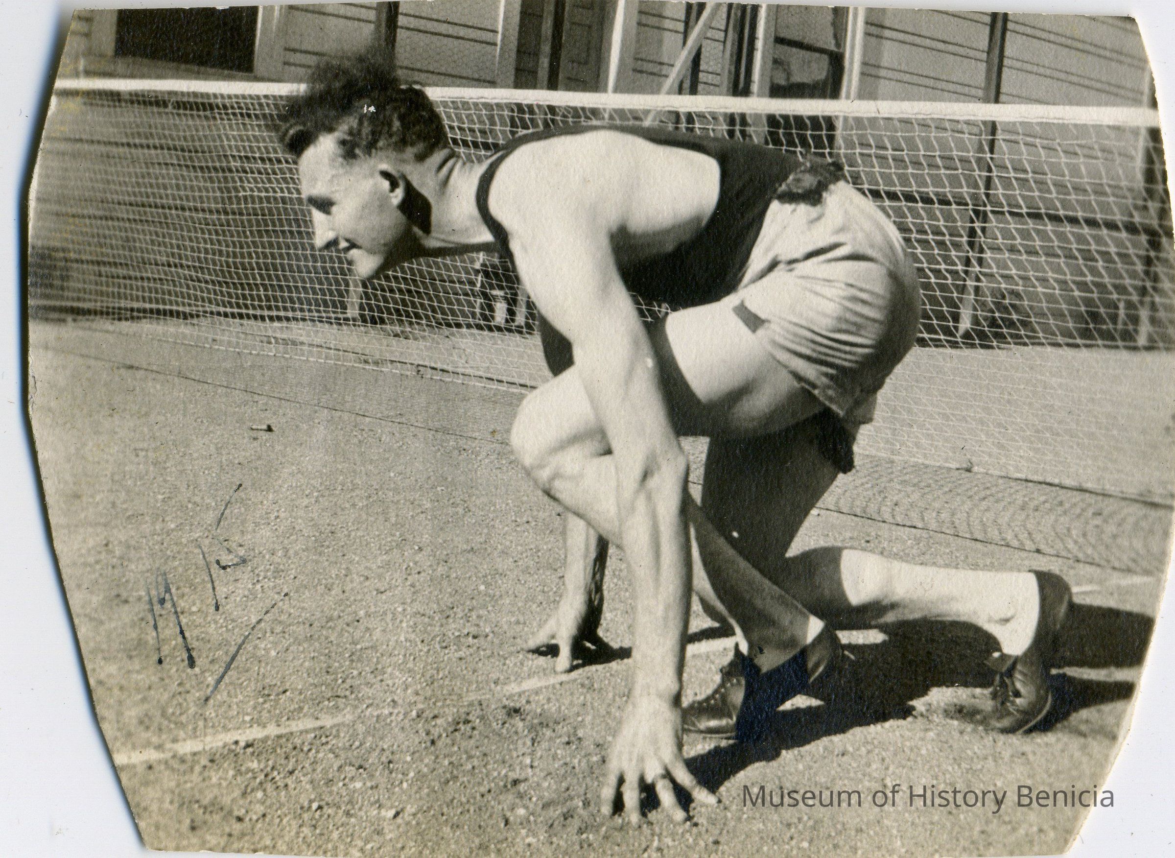 Cutts in starting position to run in track meet. Black and white photo.