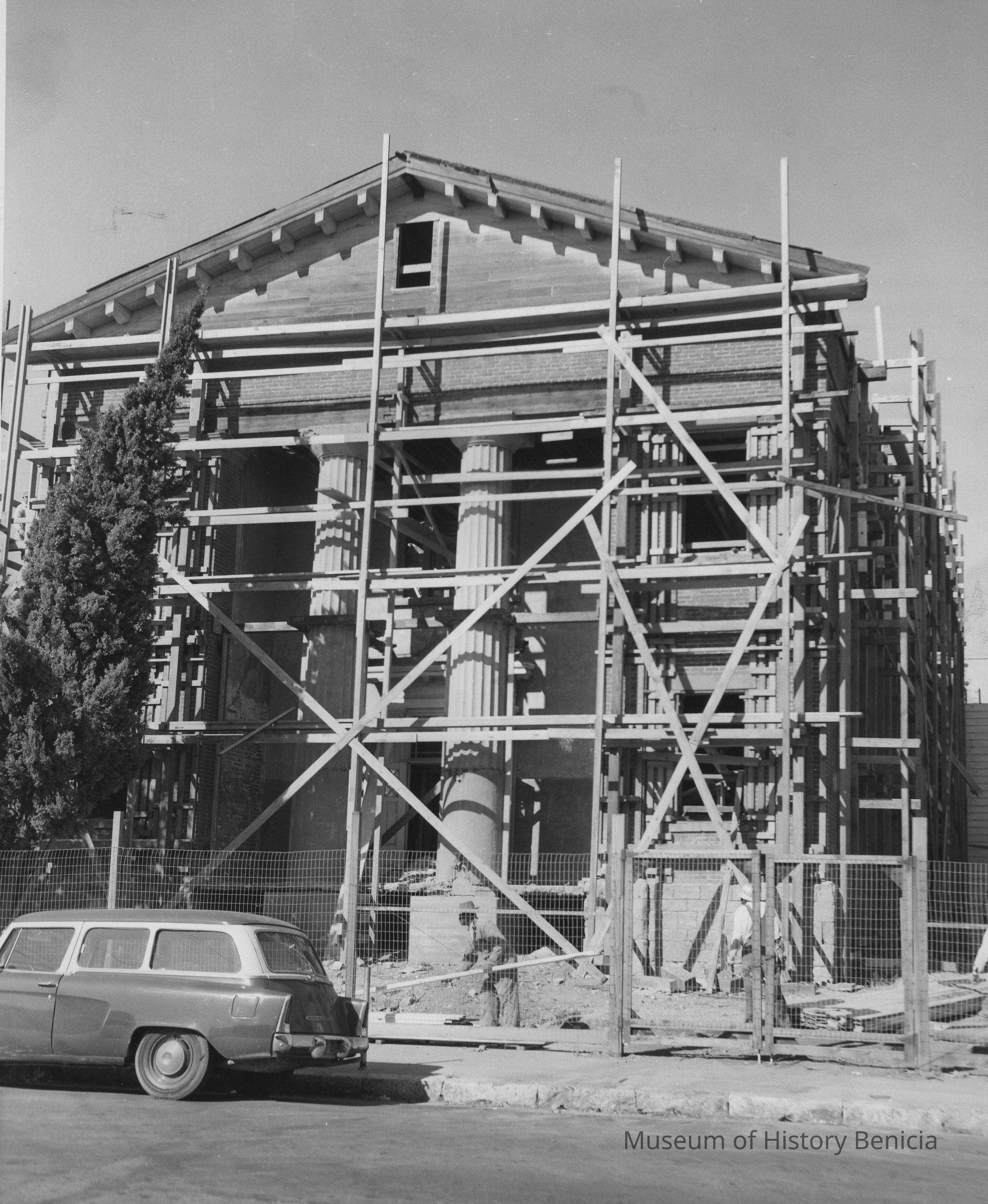 B/W photograph of Renovation of Benicia State Capitol. (front view) see also 1984.001.0018 and 1984.001.0048