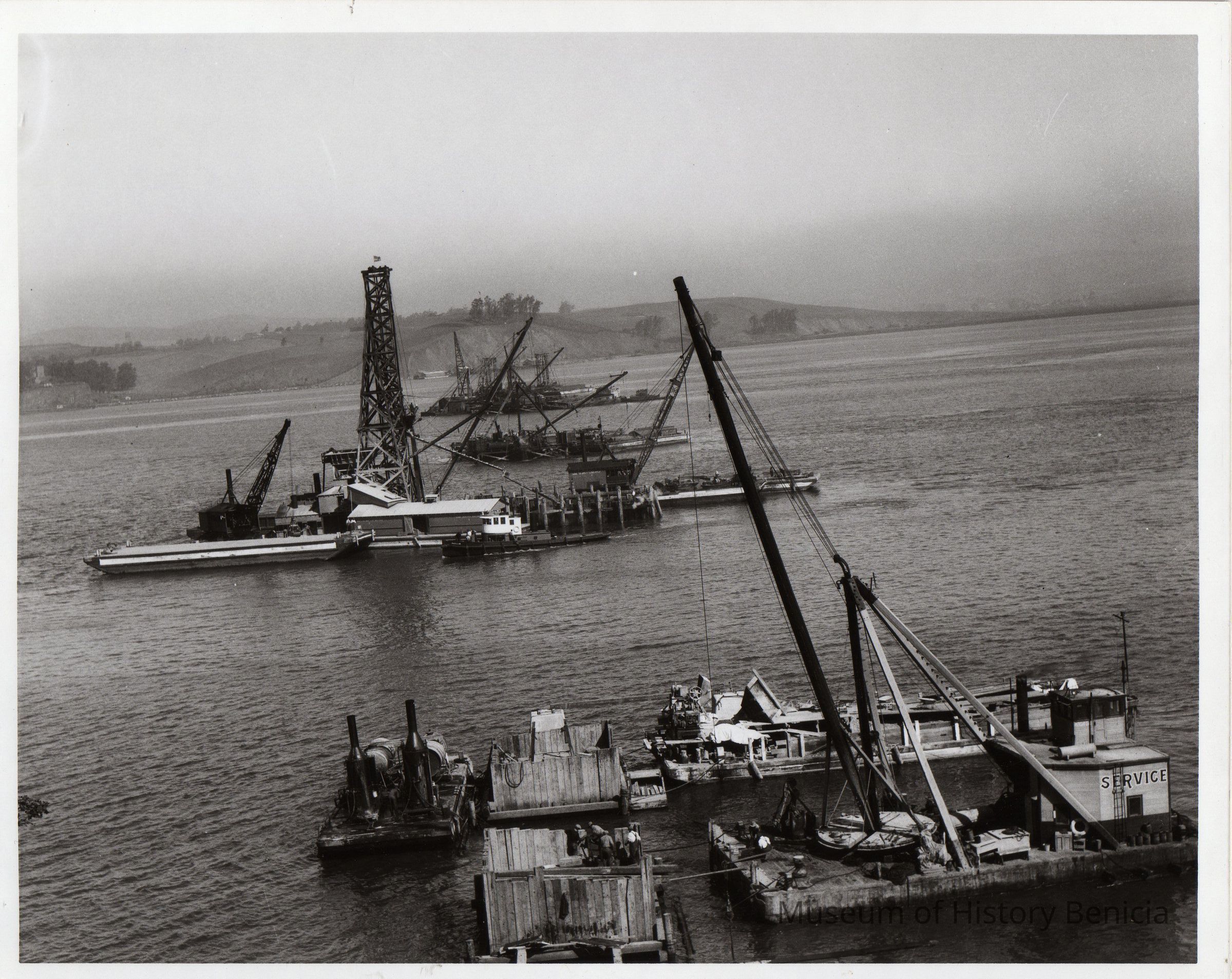 B/W Photograph: Construction of pylons on Benicia-Martinez rail bridge.