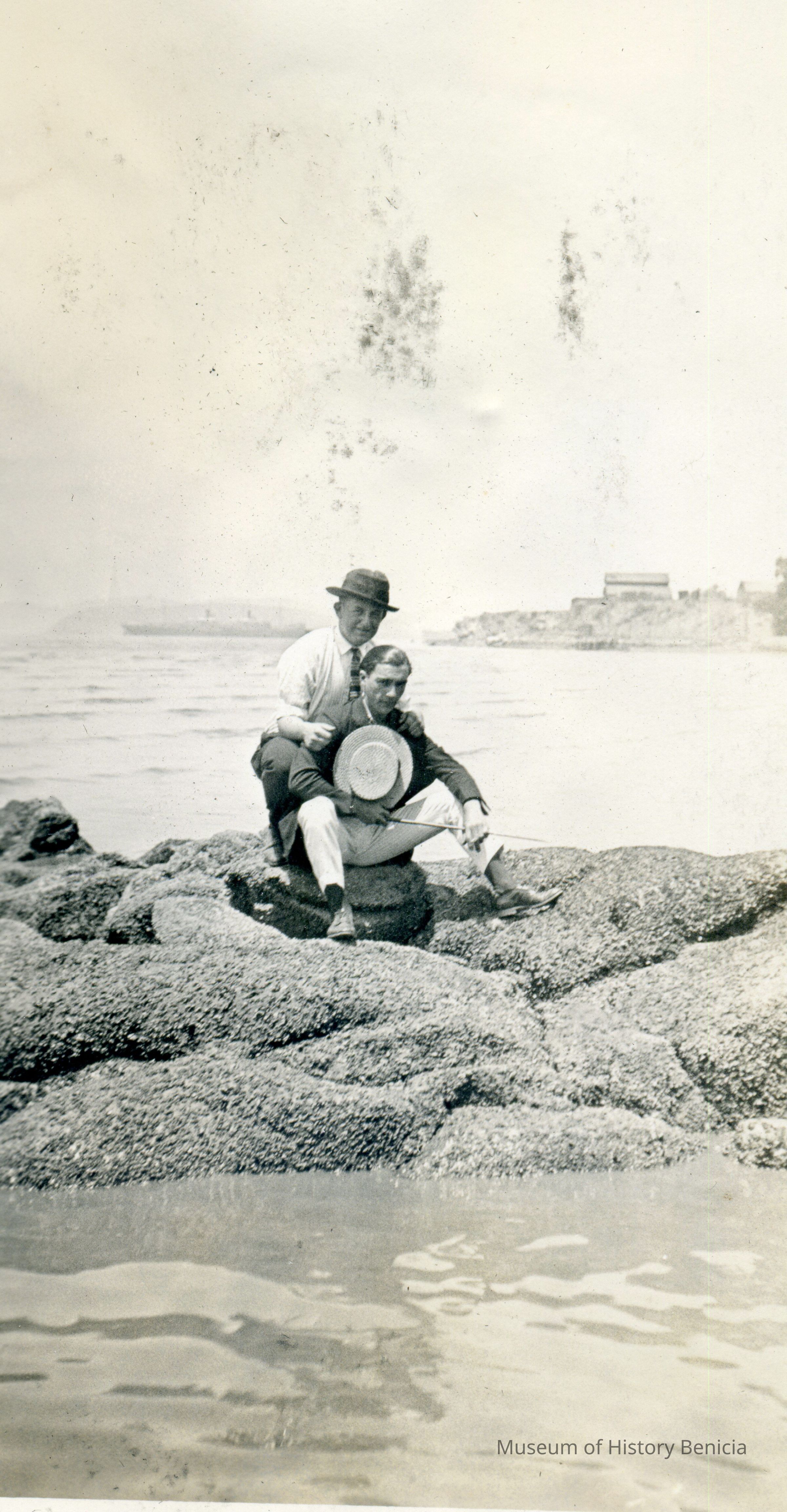 This photo shows two men standing on the rocks by Benicia. In the background is Dillon Point. One man has a cane and is wearing a straw hat. The other is wearing a hat but no coat.Collection