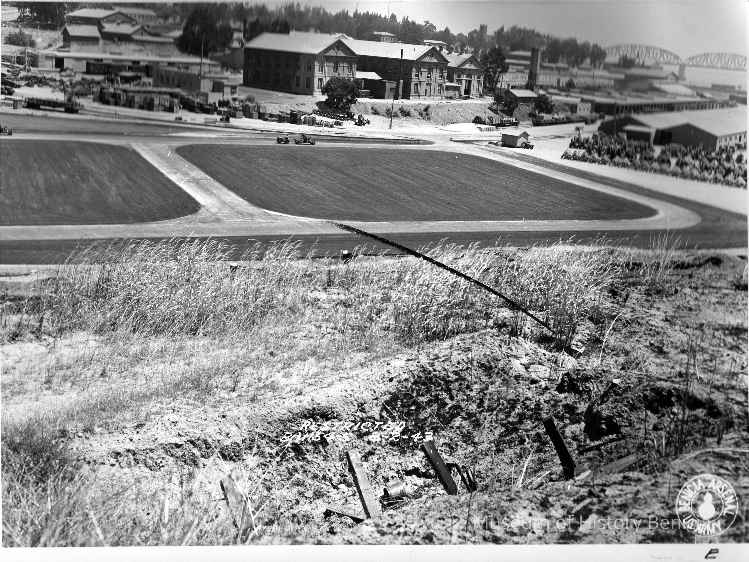 B/w Benicia Arsenal. Notice Train bridge in upper right corner. Image was Restricted.