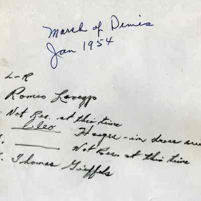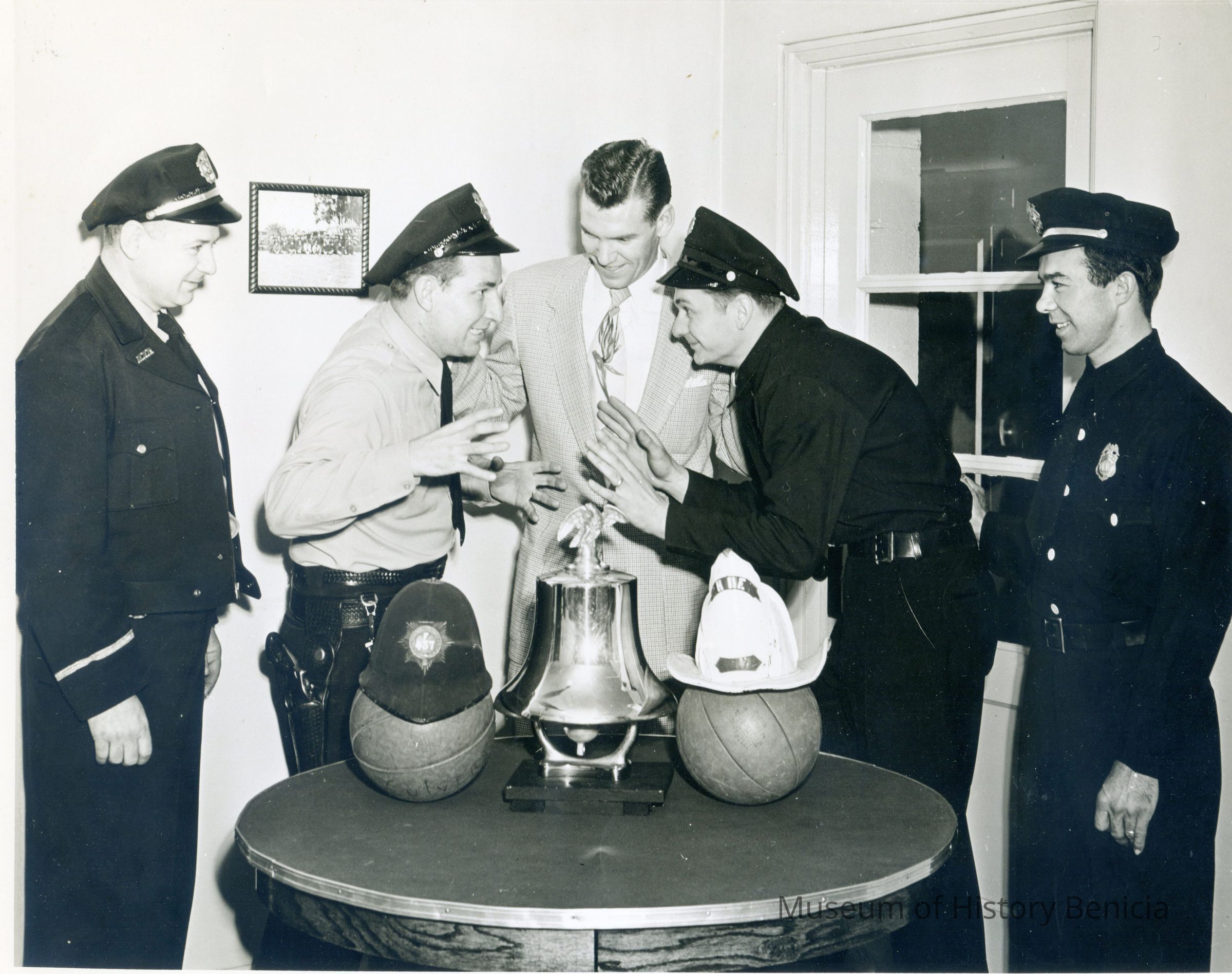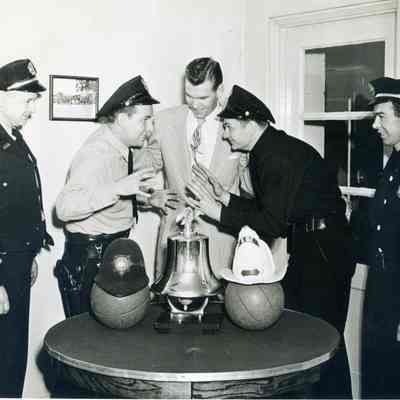Photo of a group of policemen and firemen around a table. The back identifies them as being part of the 1954 March of Dimes:
