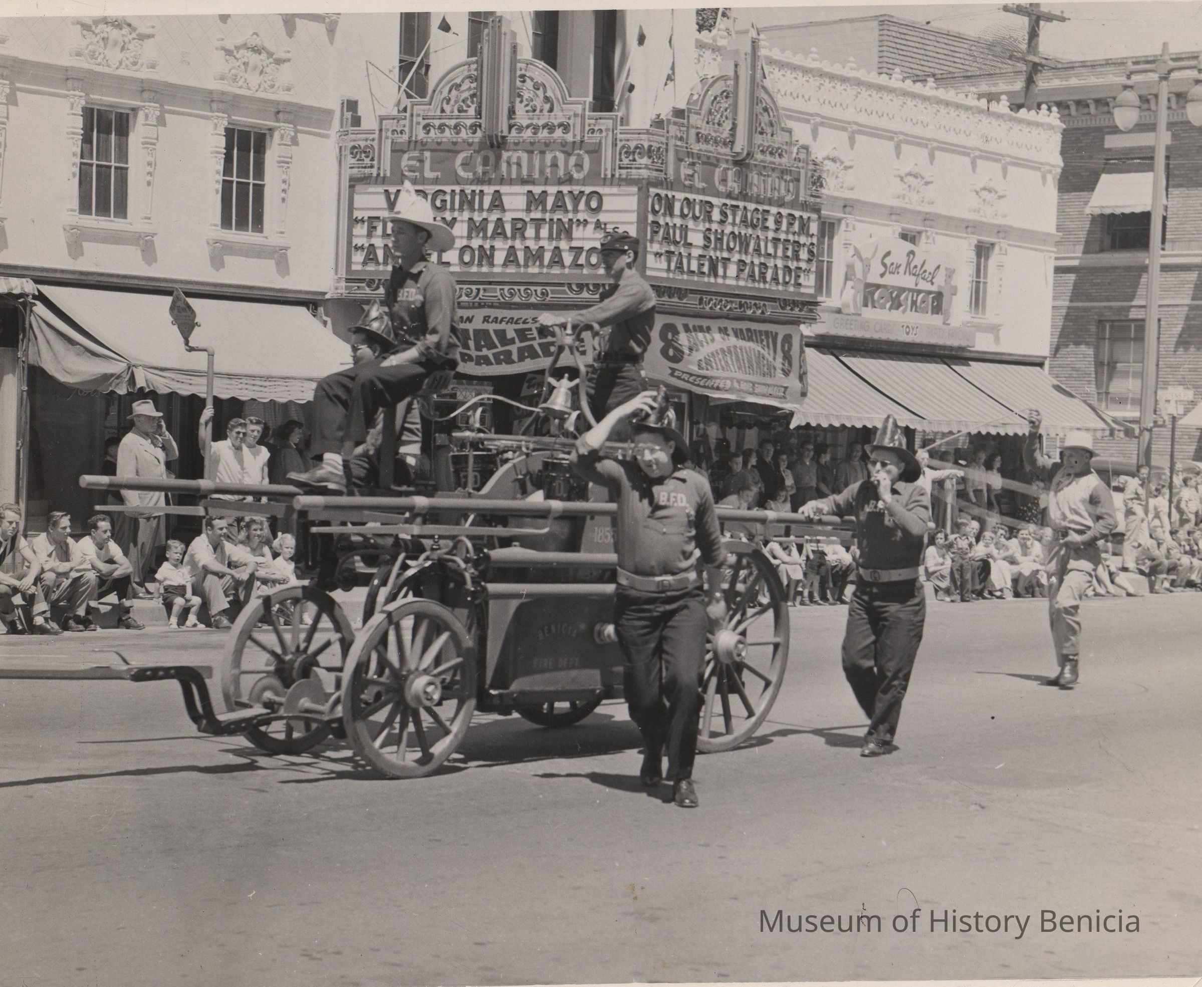 B/W photograph: Unidentified Benicia firemen riding old pumper in a parade in San Rafael. Walking: Delmar Clyma, Adolph Botti. .