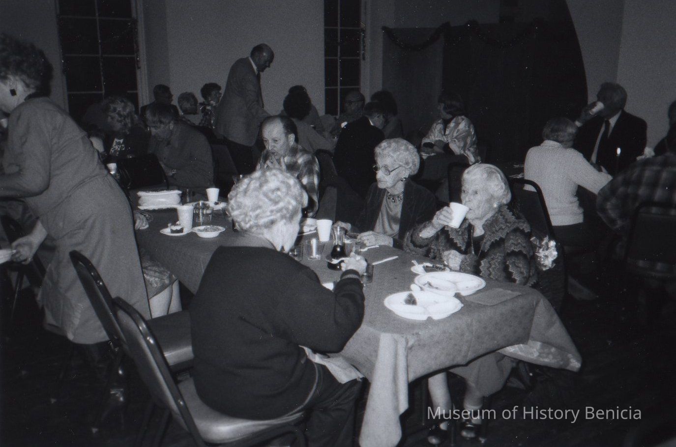 B/W photo of Camel Barn Museum Christmas Party, 1986. Large number of people seated at tables; 2 women right center are Erma Wright and Ruth Alexander. Names of identified people written on back of photo.Collection