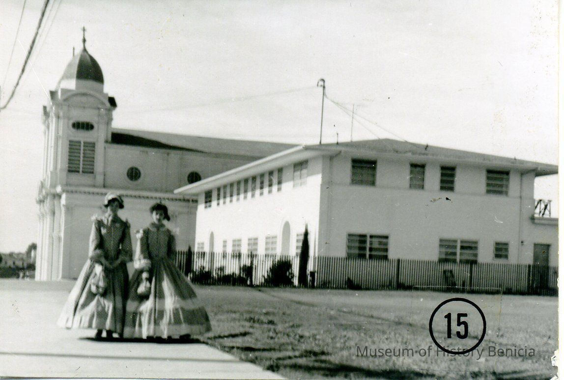 B/W photograph of two girls standing near St. Dominic's Church (prior to the building of St. Dominic's School to the right in the picture. The girls are dressed in period costumes, most likely for a 1958 City Celebration. The number 15 in a circle indicates the number of the photo which appears on page 60 in the Benicia High School 1958 Yearbook on a "candids" page. It corresponds to a caption: "The Old Days".Collection