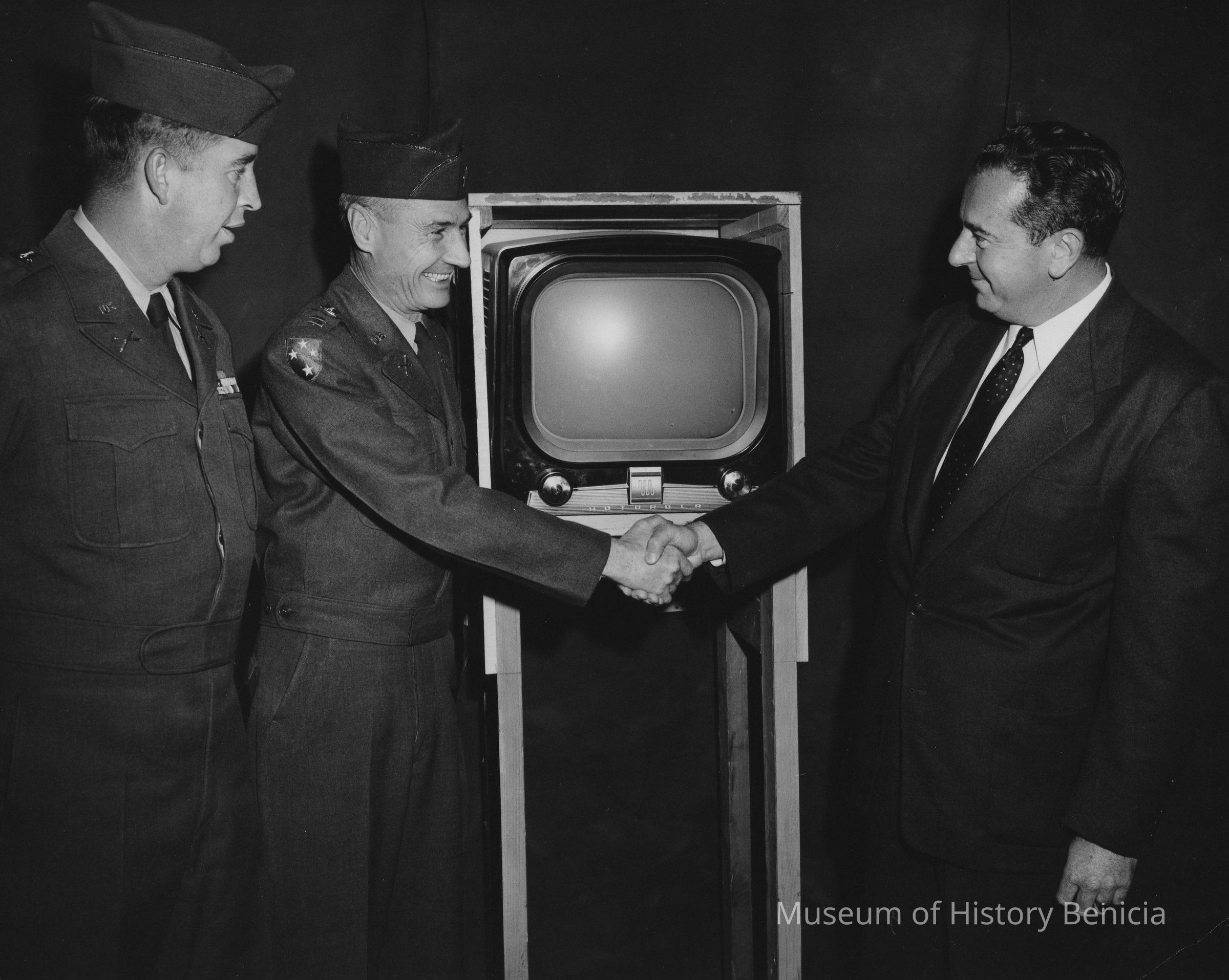 B/W Photograph: per attached news release on back: "The smile and the handclasp of Capt. Edward W. Nicholls, commanding officer of Battery B, 740th Anti-aircraft Artillary Missile Battalion, stationed at Benicia Arsenal, expresses to Al Cummins, manager of the Sterling Furniture Company of Vallejo, the appreciation of his men and himself for the gift of the television set shown in the picture."