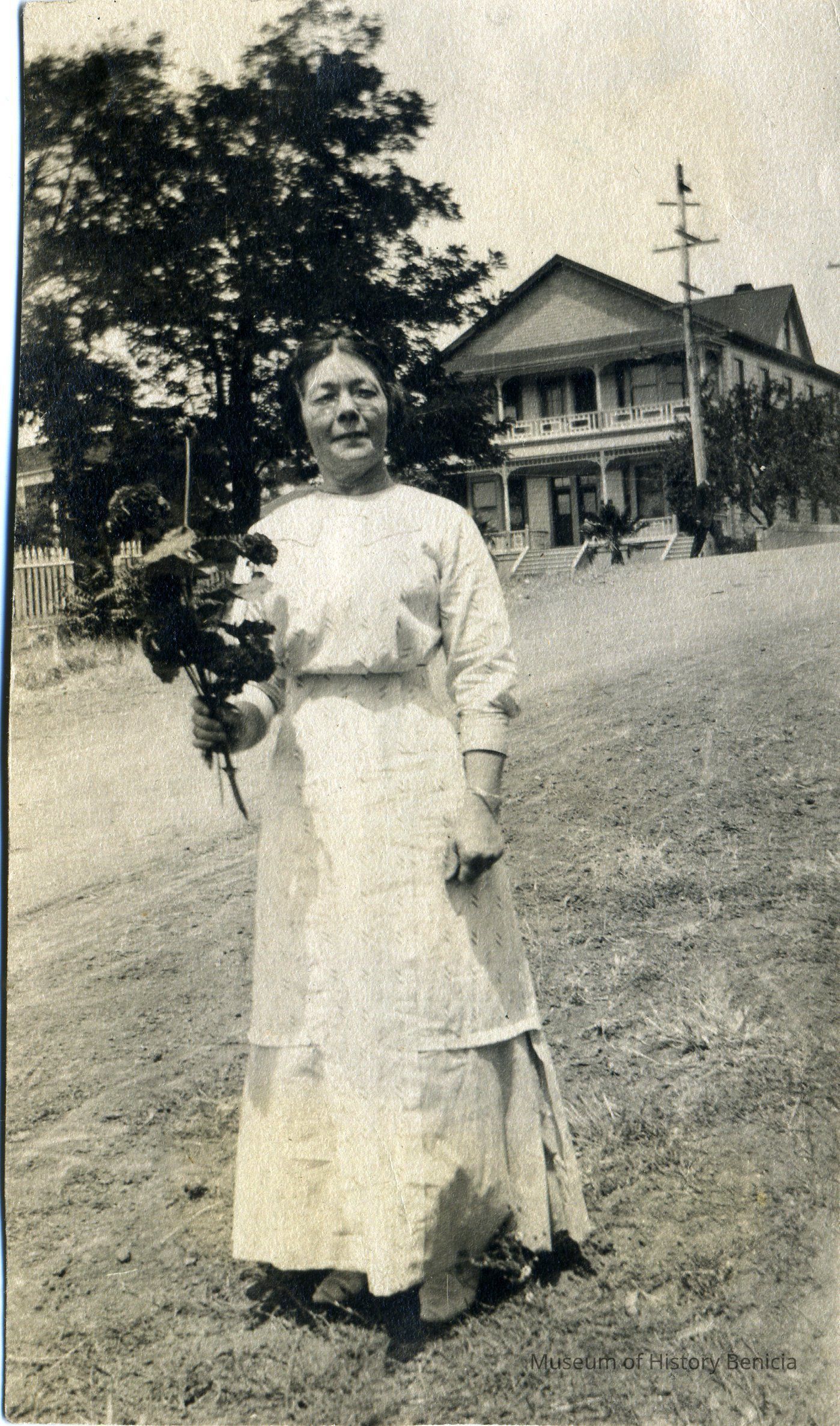 Marian Williams (Ruth Alexander's mother) standing beside Andrew Johnson Apartments beside the Dials Antique Store. B/W photo.