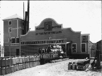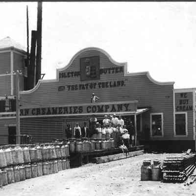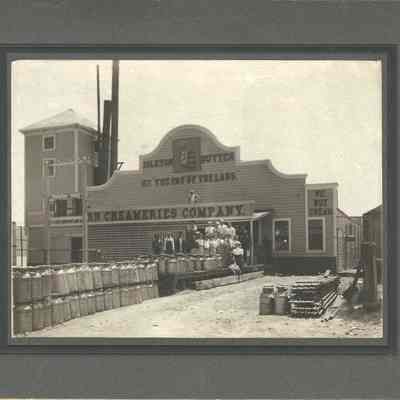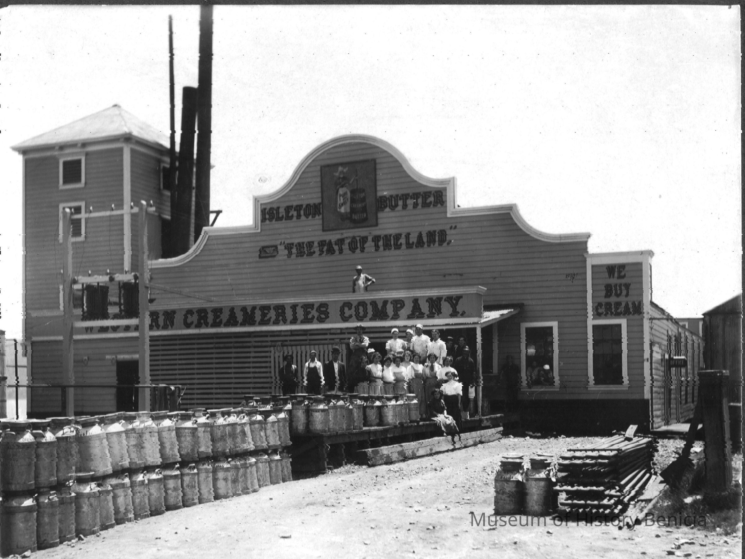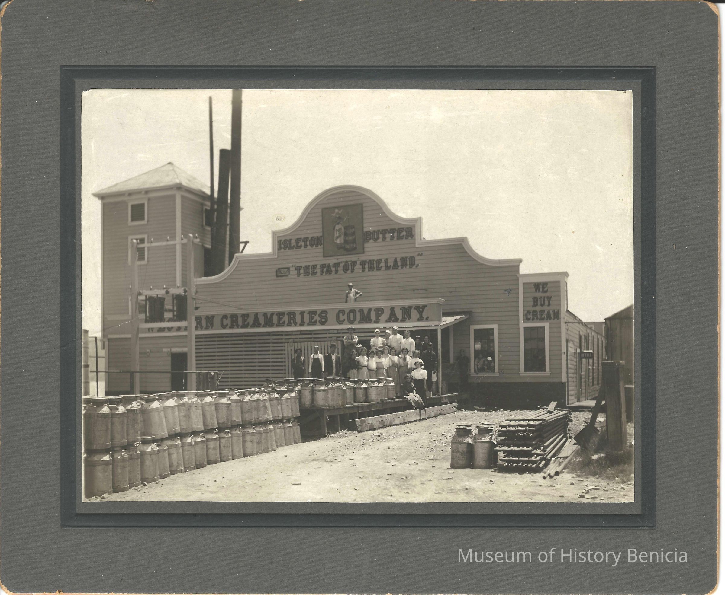 B/w mounted photograph of the Isleton Butter Co. "The fat of the land." Workers (men and women) are posing in front of the building.