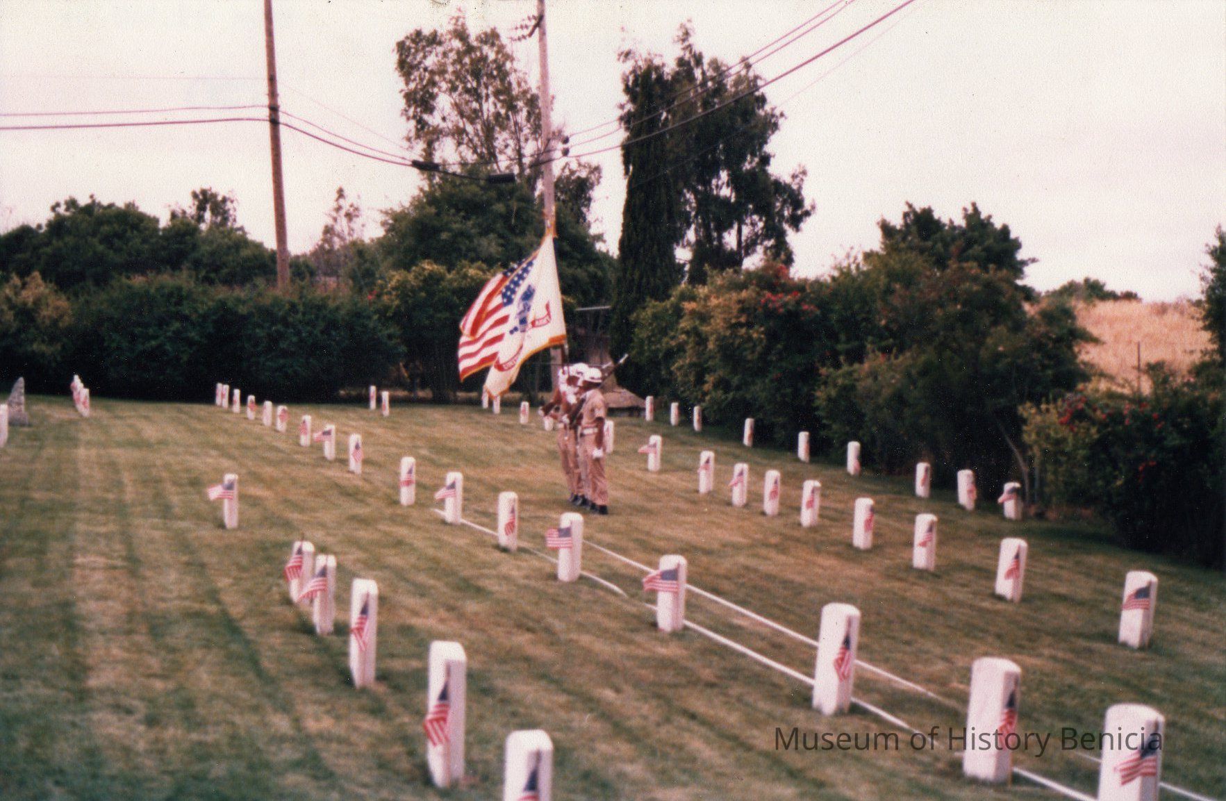 Color Photograph: Four soldiers with flags and rifles, side view. Benicia Military Cemetery, Memorial Day 1983.