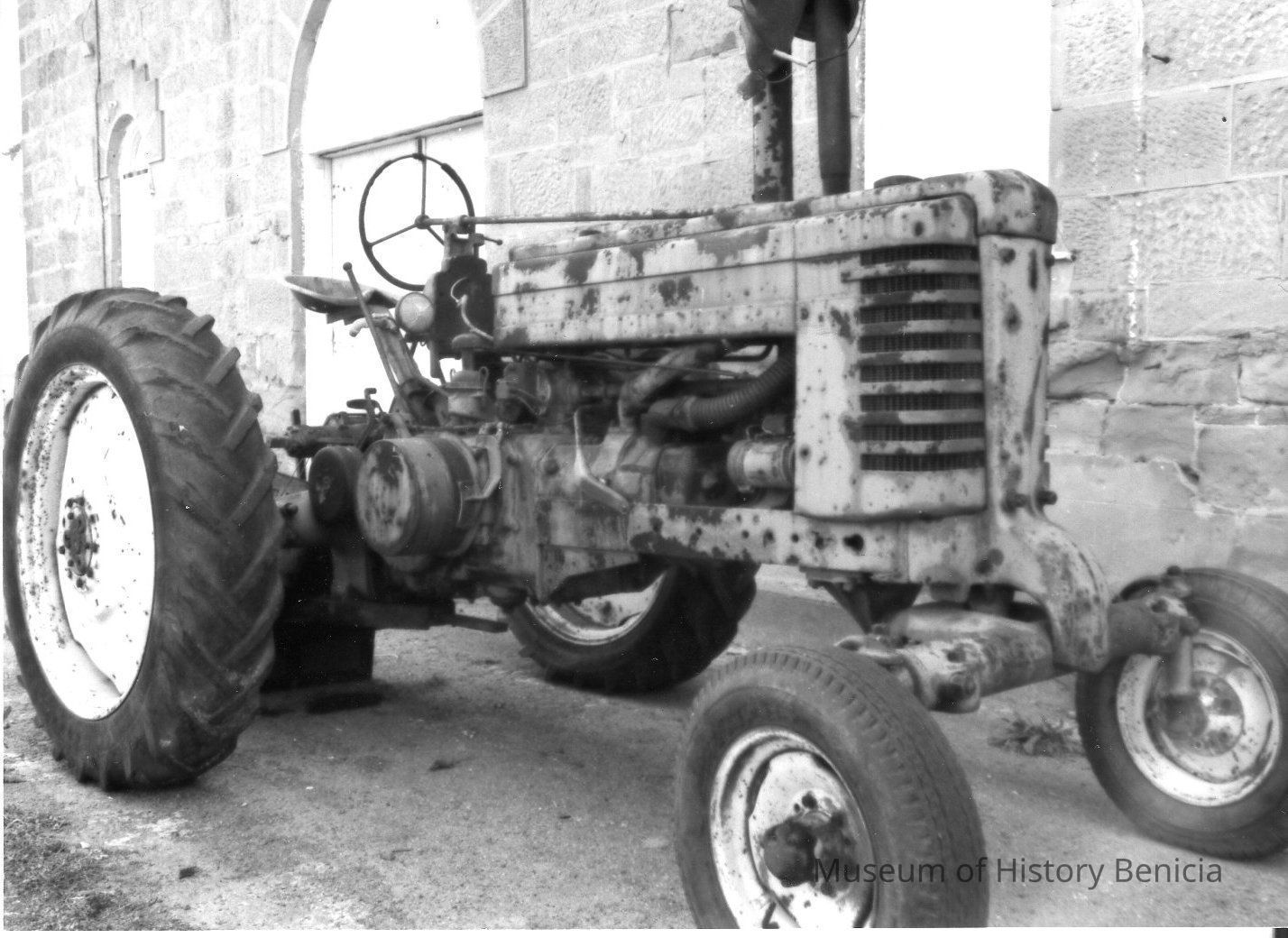 B/W photo of Urban Braito's tractor, used at the Benicia Dump. Braito's farm tractor was donated to the Camel Barn Museum.
