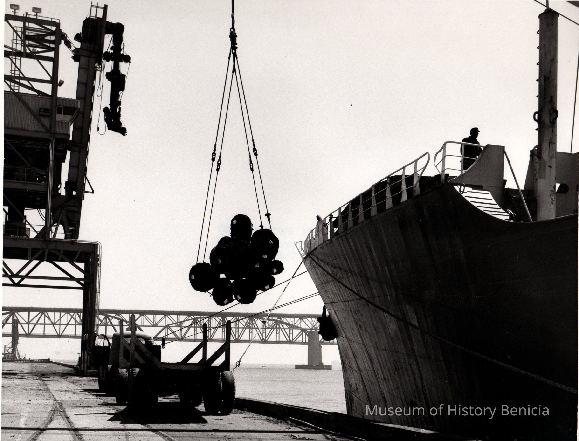 B/W photograph: Loading ship at dockside (with cargo net). Railroad bridge in background