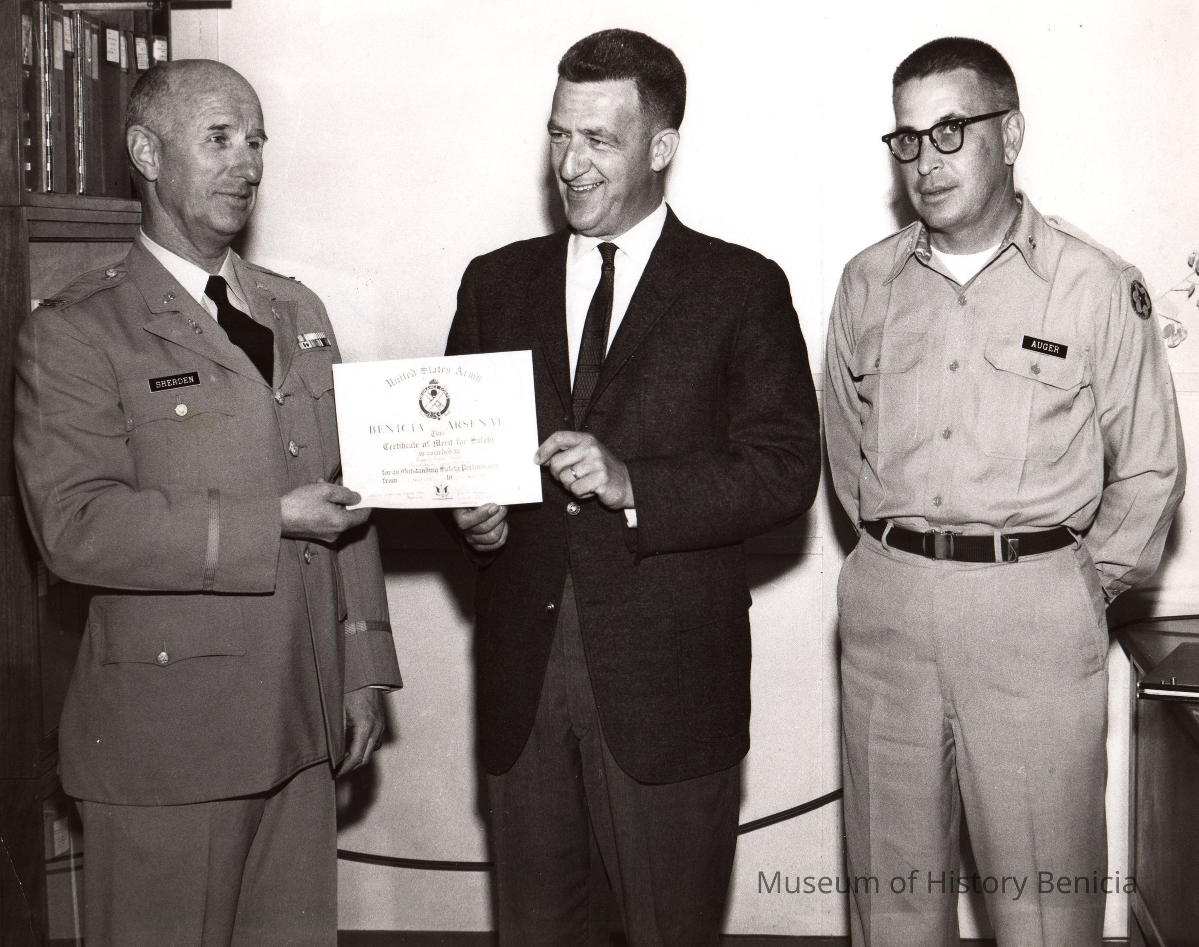 B/W Photograph: Three men, two in uniform, in an office. "Col. John Sheriden, Lt. Col. Giles Gordon, Lt. Col. Leonard Auger" and "Peg Auger" on back in ink. Mr. Gordon holds safety certificate with Col. Sheriden.Collection