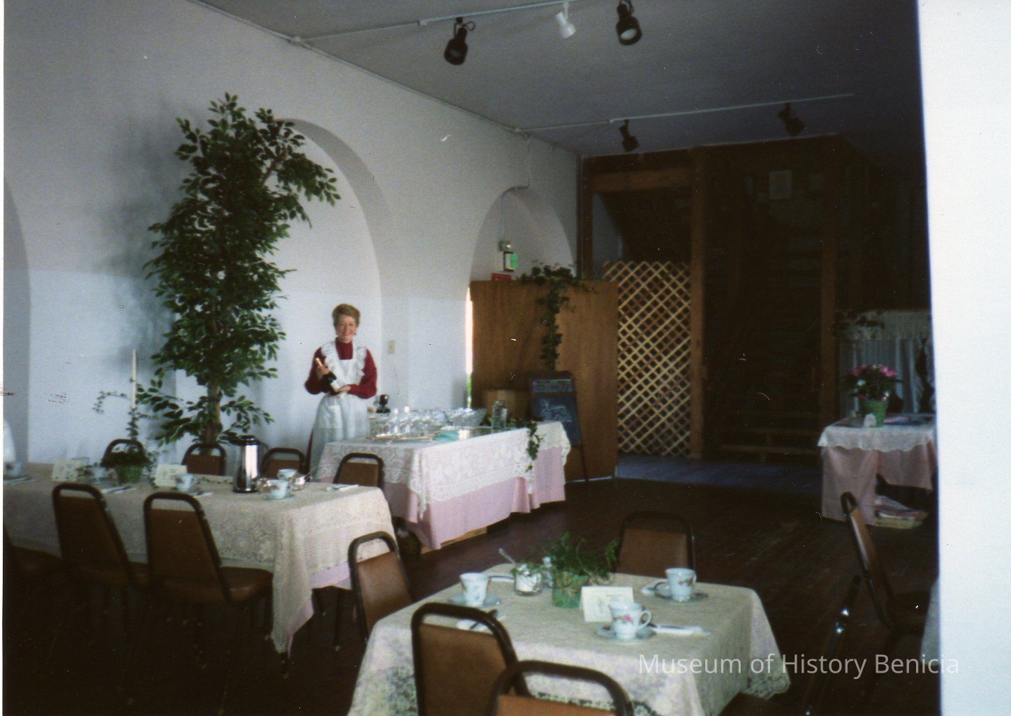 color photo of Kate McNamara (per back of photo) standing near tables prior to the start of the tea