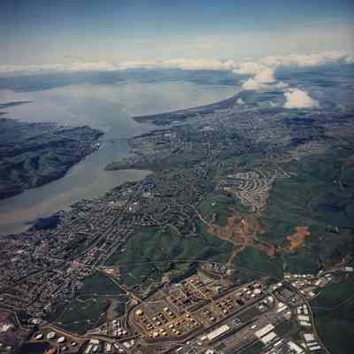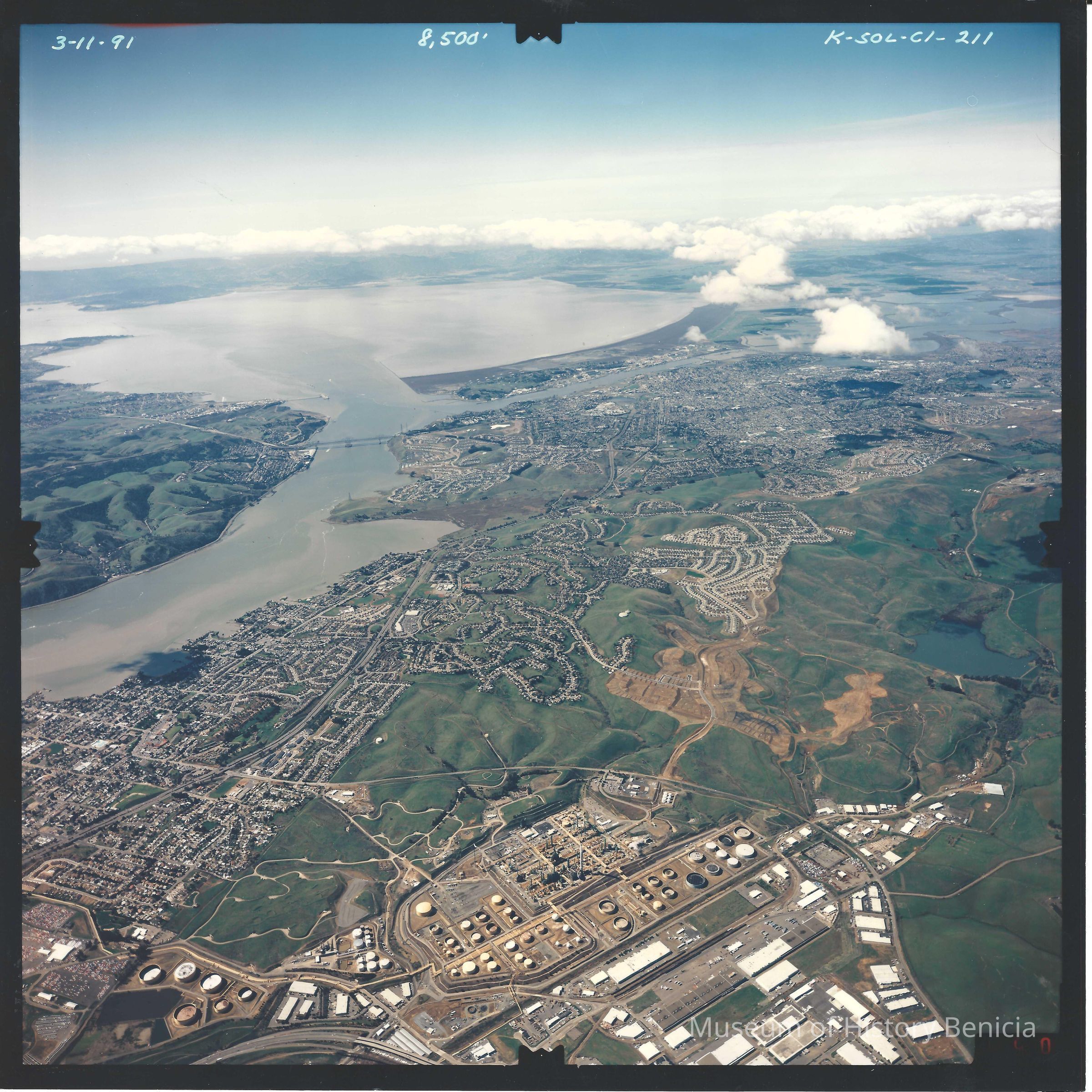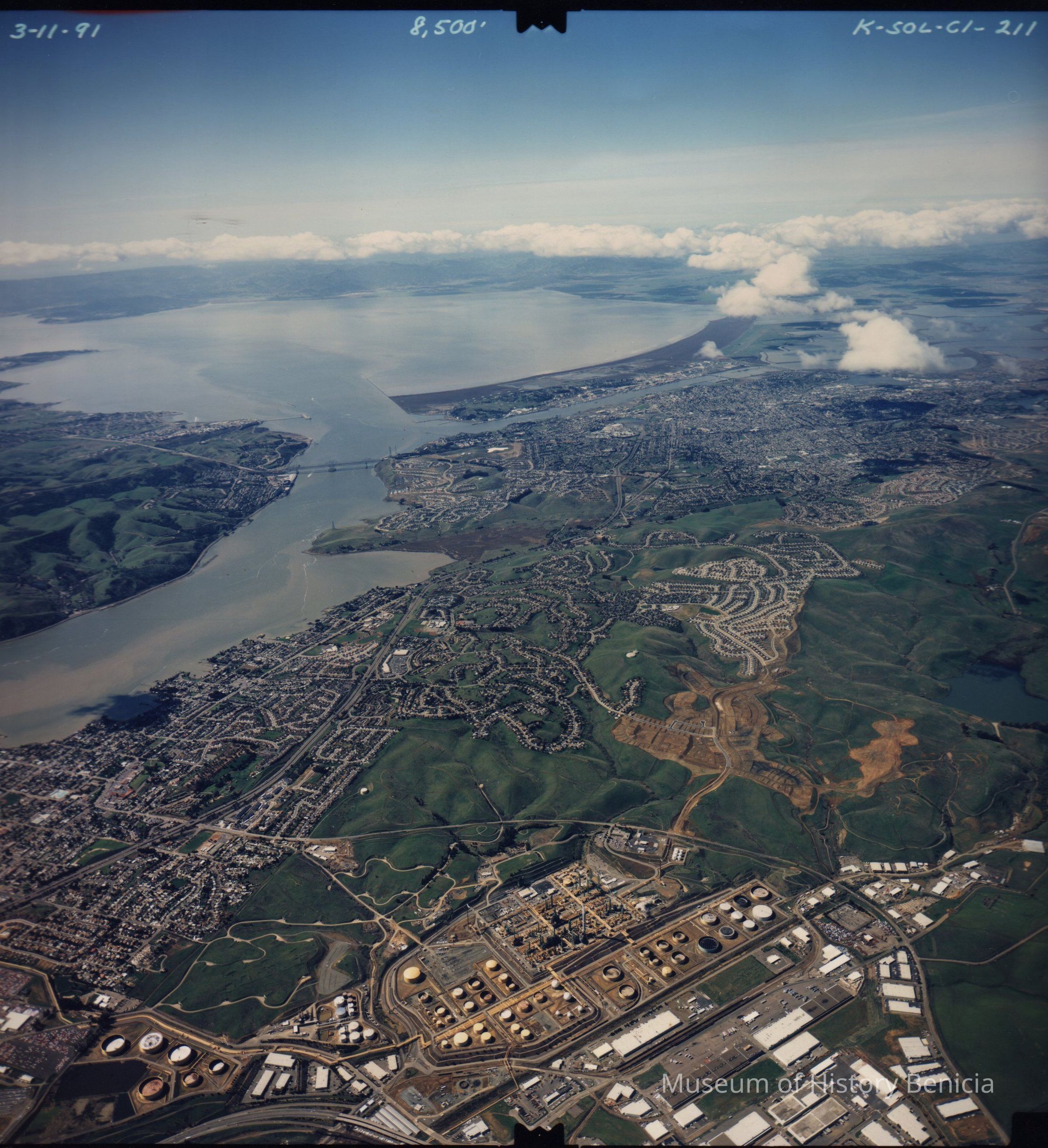 Color photograph taken 8500 ft. above I-680 near Lake Herman Road, looking over refinery and Southampton development toward Vallejo and San Pablo Bay.Collection