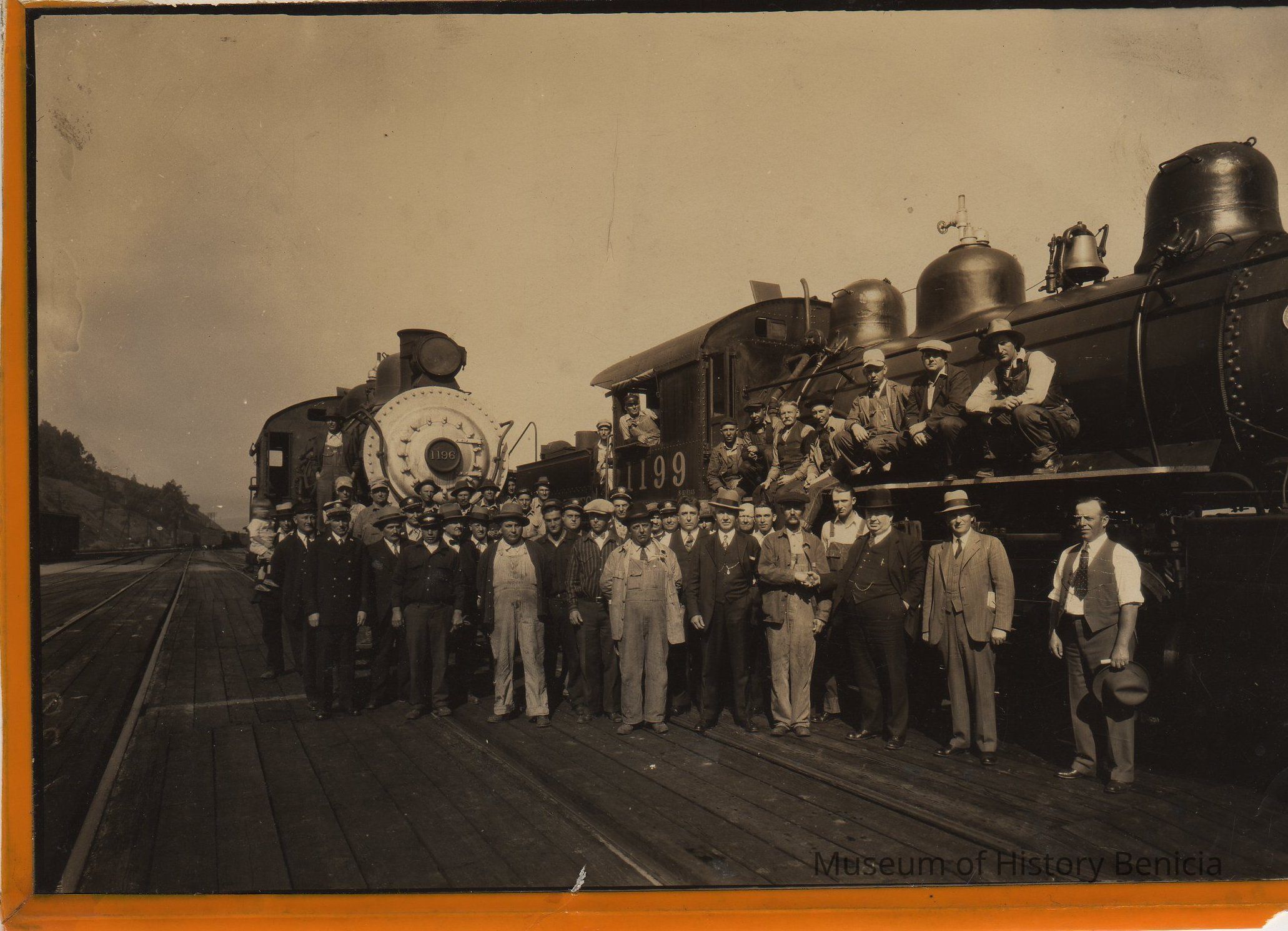 B/W Photograph: shows a group of men standing in front of Southern Pacific engines 1196 and 1199 at Port Costa.