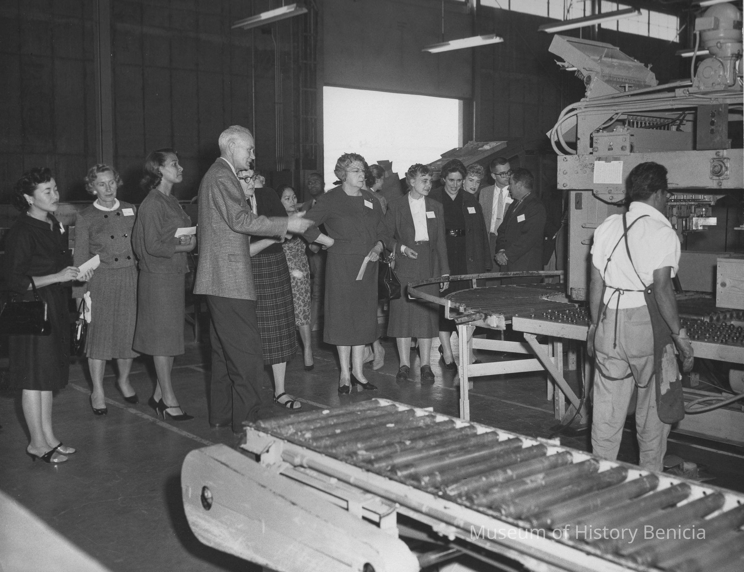 B/W photograph which appeared in the "Benician" newspaper on Friday November 18, 1960 with the following caption: "A group of San Francisco educators observe a phase of shipping operations at Benicia Arsenal during a day-long visit to the installation as part of Business- Education Day, an annual program conducted jointly by the San Francisco Chamber of Commerce, the San Francisco Board of Education and the San Francisco Unified School District. This is the second year the educators visited the arsenal to observe Ordnance supply operations. J. C. McNamara, chief of Receiving and Shipping Branch is explaining operation of a machine for nailing boxes."Collection