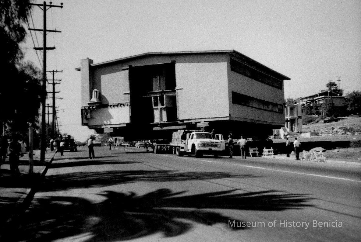 St. Catherine's boys' dormitory being moved to its current location in the 100 block of East K Street between First and East Second. The building is now the Benicia Youth Center. B/W photo.Collection