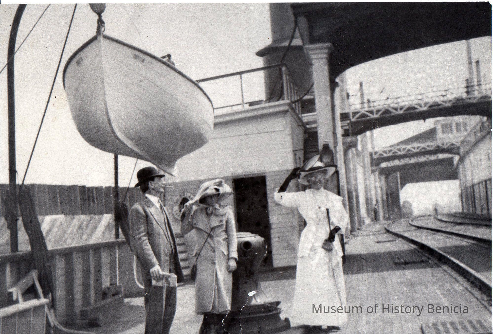 B/W photograph of one man and two women passengers aboard the train ferry "Solano".