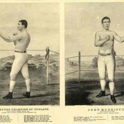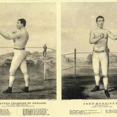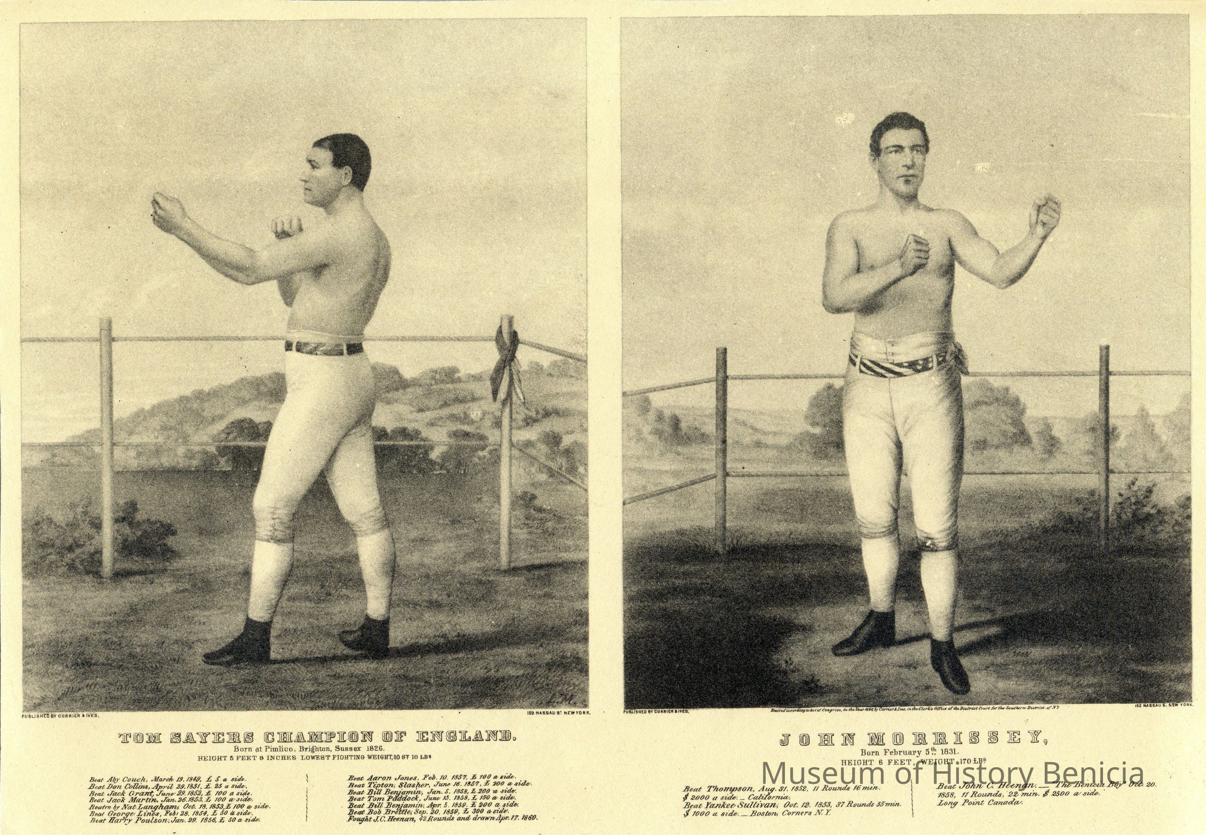 A copy of a Currier and Ives Lithograph (black on faded yellow background) with individual images of Tom Sayers Champion of England and John Morrissey. Information regarding the two men is printed beneath each picture.Collection