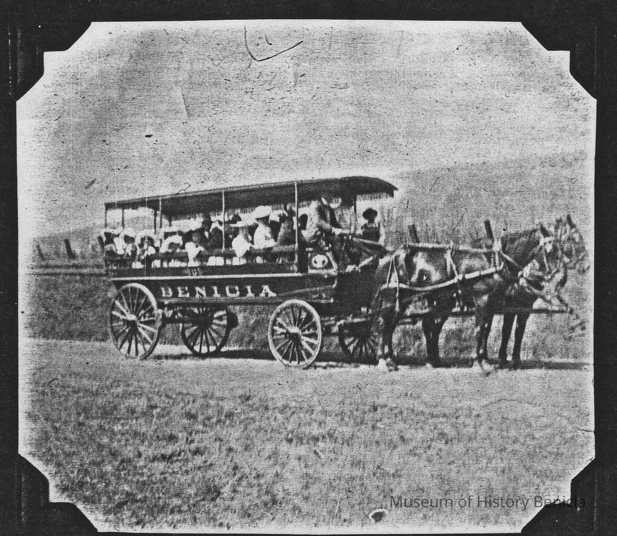 B/W photocopy of an album page with a photograph of the Benicia Stage with unidentified townspeople on board, centered on the page.