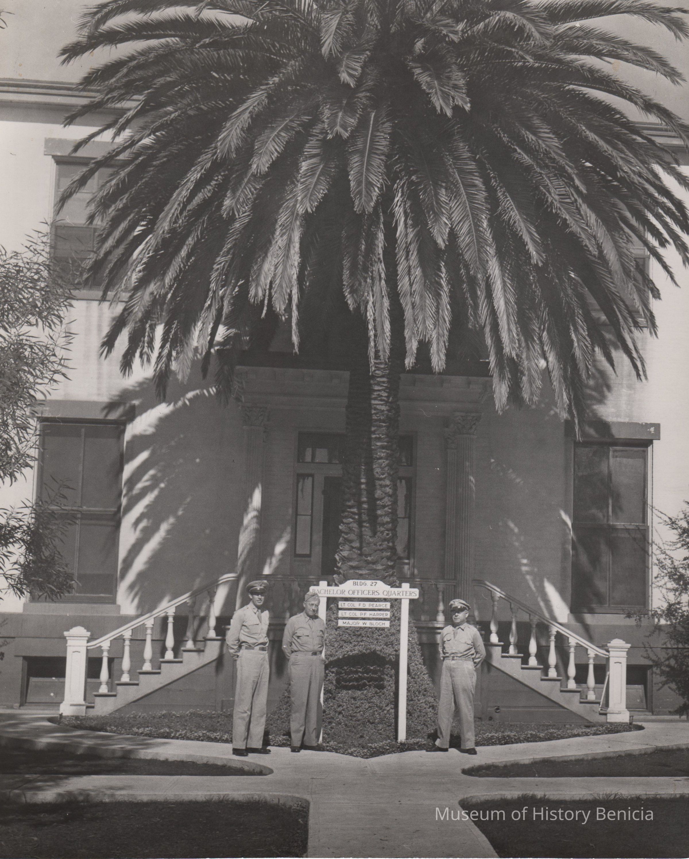 Three officers; Lt. Col. F.D. Pearce, Lt. Col. P.F. Harper, Maj. W. Bloch, standing in front of Building 27, labeled "Bachelor Officers' Quarters." Building built in 1861, also known as the Lts. Quarters. Black and white photo.Collection